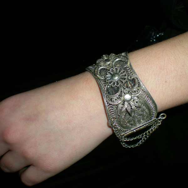 Χειροποίητο κόσμημα χειρός. Άπταιστη δημιουργία απο γνωστό Έλληνα καλλιτέχνη. Τα μικρά ασημένια κομμάτια σύρματος που το απαρτίζουν σχηματίζουν σχέδια απο άνθη και λουλούδια. Παλιότερα φοριόταν απο γυναίκες στο γάμο. Περνιέται στο δεξί χέρι και εκφράζει τη γονιμότητα της γυναίκας. Ανοίγει και κουμπώνει με ένα πυράκι στη μέση του βραχιολιού.