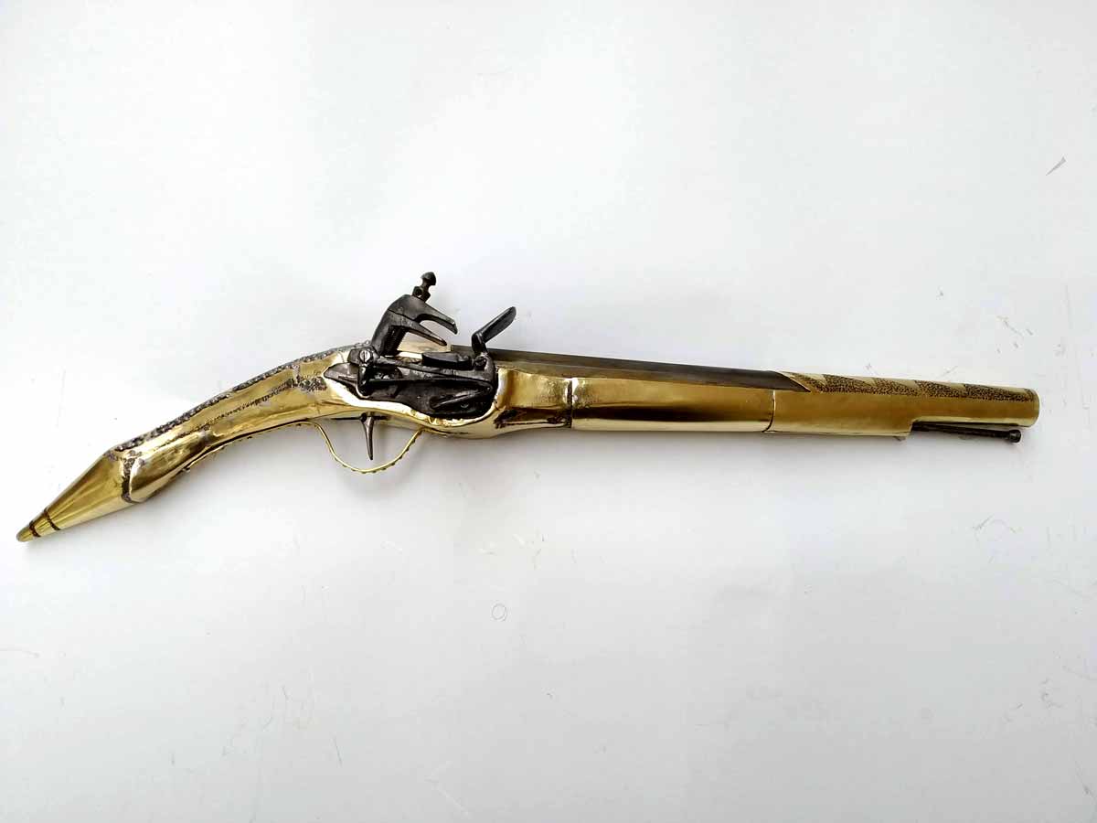 Πιστό αντίγραφο απο Αρβανίτικη ποντικοουρά. Αποτελείται απο ξύλο ψημένης καρυδιάς, τυλιγμένο με φύλλο ορείχαλκου σκαλισμένο στο χέρι. Η κάνη είναι σε οκτάγωνο σχήμα και καταλήγει σε στρόγγυλο, το μήκος της είναι 32cm. Ο μηχανισμός είναι τύπου miquelet. To συνολικό μήκος της πιστόλας είναι 52cm.