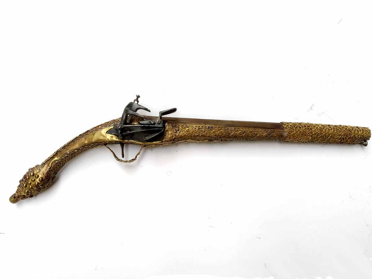 Πιστό αντίγραφο απο Αρβανίτικη Κουκουνάρα. Αποτελείται απο ξύλο ψημένης καρυδιάς, τυλιγμένο με φύλλο και σκαλιστά κομμάτια ορείχαλκου. Η κάνη είναι σε οκτάγωνο σχήμα και καταλήγει σε στρόγγυλο, το μήκος της είναι 34cm. Ο μηχανισμός είναι τύπου miquelet. To συνολικό μήκος της πιστόλας είναι 53cm.