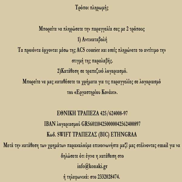 Whoops, we detected that your browser does not have JavaScript, or it is disabled. Our product catalog requires that you have JavaScript enabled to order products. Netscape and Microsoft offer free browsers which support JavaScript. If you are using a JavaScript compliant browser and still have problems, make sure you have JavaScript enabled in your browser's preferences. Παρακαλούμε συμπληρώστε τα πεδία για την ολοκλήρωση της παραγγελίας . Πληροφορίες Εγγραφής : Όνοματεπώνυμο Διέυθυνση α: Πόλη: Περιοχή/Νομός: Ταχ.Κωδ.: Τηλέφωνο: Φαξ: Email: Πληροφορίες Παράδοσης (συμπληρώστε μόνο εαν είναι διαφορετικά απο τα παραπάνω): Όνομα: Διέυθυνση α: Πόλη: Περιοχή/Νομός: Ταχ.Κωδ.: Τηλέφωνο: Φαξ: Email: Σε περίπτωση που επιθυμείτε την έκδοση τιμολογίου αντί απόδειξης λιανικής πώλησης, παρακαλούμε συμπληρώστε τα παρακάτω πεδία. Τύπος παραστατικού απόδειξη λιανικής πώλησης τιμολόγιο πώλησης Επωνυμία επιχείρησης Α.Φ.Μ. Επάγγελμα Δ.Ο.Υ. Διευκρινίστε τον τρόπο πληρωμής: Τρόπος πληρωμής αντικαταβολή κατάθεση σε τράπεζα πληροφορίες Σχόλια / Οδηγίες :