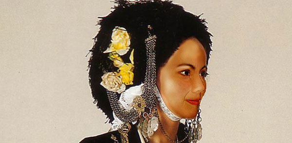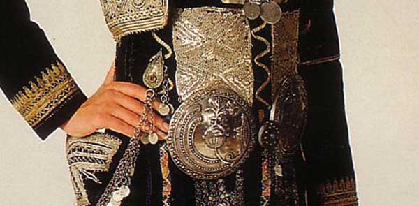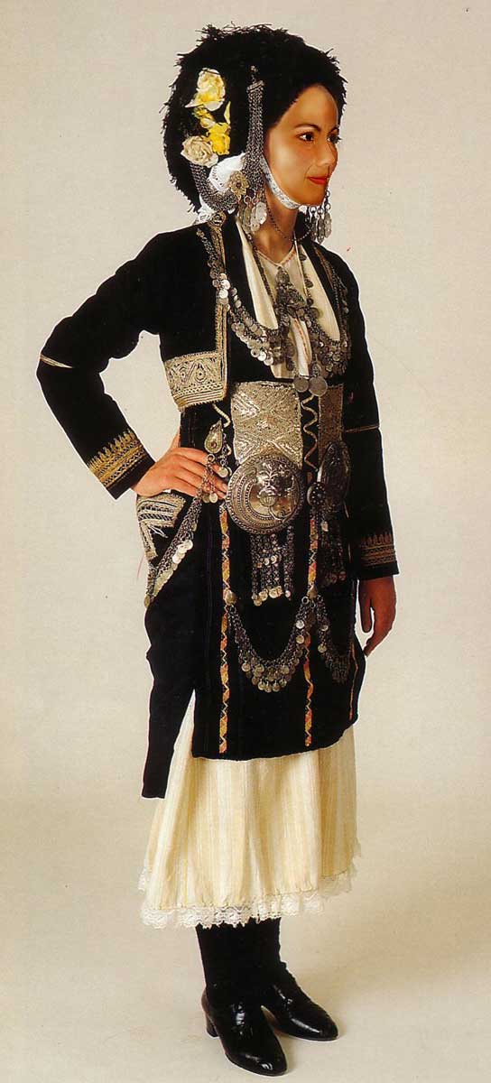 Εντυπωσιακή γιορτινή φορεσιά,που συνδυάζει αρμονικά την αρχαία ελληνική παράδοση και ιδαίτερα τους θρύλους του Μεγαλέξανδρου με βυζαντινές και νεοελληνικές εμπνέυσεις.Αποτελείται απο το πουκάμισο απο λεπτό βαμβακερό ριγωτό ύφασμα του αργαλειού και το κυανόχρωμο βαμβακερό υφαντό σαγιά με τα κοντά μανίκια και τις βελούδινες ποδιές στολισμένες με ασημένια γαϊτάνια.Οι δυο άκρες του σαγιά, οι ποδιές ,γυρίζουν προς τα πίσω και στολίζουν την πλάτη.Πάνω απο το σαγιά φοριέται μάυρο μάλλινο κοντόσι,στολισμένο με ασημογαϊτάνια και ασημοκεντήματα.Στη μέση δένεται η μάλλινη ποδιά υφασμένη και κεντημένη στον αργαλειό.Μοναδικό είναι το στόλισμα του κεφαλιού,το δέσιμο του οποίου θυμίζει έντονα αρχαίο πρότυπο.Τη μεγαλοπρέπεια της φορεσιάς τονίζουν το σμαλτωμένο γιορντάνι του λαιμού,η ζώστρα με τις διπλές αλυσίδες και τους παράδες,ο ασημοσουγιάς,τα μαλακοκαπνισμένα κοσμήματα στους κροτάφους και το ασημοκαπνισμένο καπιτσέλι.