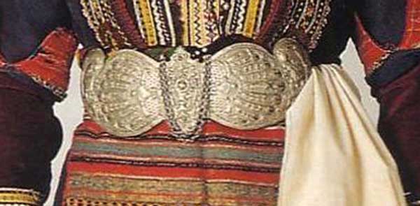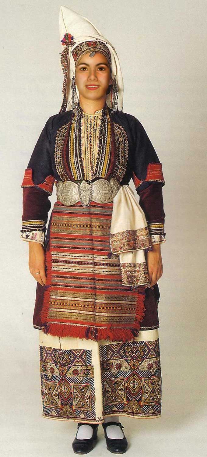 Αρχοντική φορεσιά που διακρίνεται για τα πολύτιμα υλικά κατασκευής σε βαθύχρωμους τόνους. Αποτελείται από το λινοβάμβακο πουκάμισο με χρυσοκέντημα στο γιακά και την τραχηλιά,το πολύπτυχο φουστάνι από μαύρο μεταξωτό ύφασμα με εν υφασμένα μαβιά λουλούδια,καθώς και το λιπαντέ,μπλε βελούδινο γιλέκο με όρθιο γιακά,μακριά μανίκια και πλούσιο χρυσοκέντημα σε όλα τα ανοίγματα. Στη μέση δένεται η πτυχωτή ποδιά από το ίδιο ύφασμα του φορέματος και τα μαλακοκαπνισμένα συρματερά θηλυκωτάρια. Ιδιόμορφο είναι το στόλισμα του κεφαλιού που δημιουργείται από το φέσι με χρυσοκέντητο τεπέ,χρυσές φράντζες και μακρυά χρυσή φούντα και το βαμβακερό με πολύχρωμα κεντήματα μαντήλι που τυλίγεται ολόγυρα.