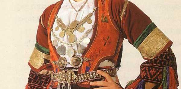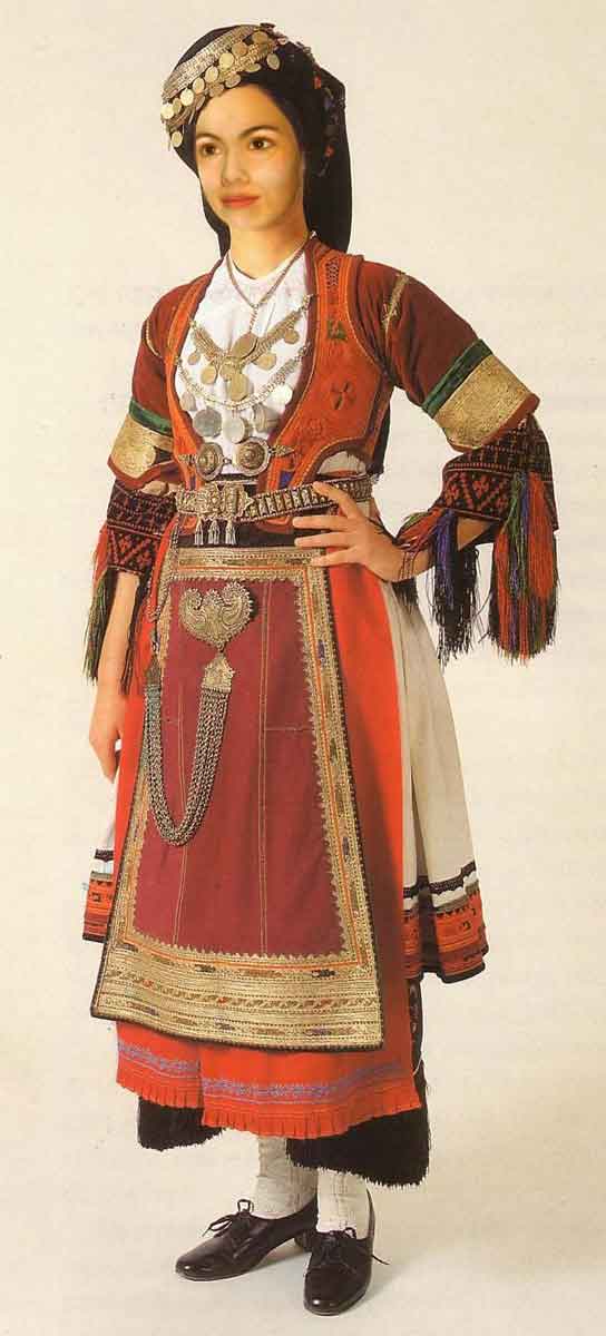 Γιορτινή και νυφική φορεσιά με έντονους χρωματιστούς, πολύπλοκη σύνθεση, πλούσια κεντήματα και πολύμορφα και πολύτιμα υλικά, όπου επιβιώνουν διαχρονικά στοιχεία. Φοριέται με παραλλαγές στα χωριά του κάμπου της Θεσσαλίας. Αποτελείται από το λινό πουκάμισο του αργαλειού με τα μακριά κρόσσια, τον άσπρο πολύπτυχο βαμβακερό σαγιά, που είναι ο ανοιχτός κατακόρυφα βαμβακερός επενδυτής, στολισμένο στα μπροστινά και στον ποδόγυρο, το ολοκέντητο γιλέκο και τη χρυσοκέντητη ποδιά. Το κεφάλι καλύπτει το μαύρο μεταξωτό με τα παρδαλούδια, τα κεντήματα δηλαδή. Εντυπωσιακά είναι τα μαλαμοκαπνισμένα κοσμήματα που στολίζουν το κεφάλι, το λαιμό, το στήθος και την ποδιά.