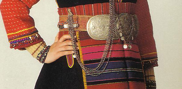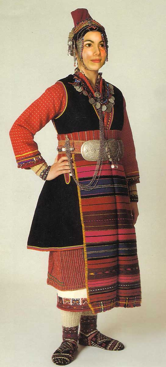 Αποτελείται από το πουκάμισο,το μάλλινο φόρεμα και ένα μαύρο σιγκούνι που σφίγγεται στη μέση με ένα κόκκινο ριγέ μάλλινο ζωνάρι. Το ζωνάρι συγκρατεί η μάλλινη κεντητή ποδιά με χαρακτηριστικές ρίγες. Στο κεφάλι δένουν μεγάλο μάλλινο μαντήλι,στολισμένο με την κορώνα,ένα ασημένιο κόσμημα που το γαντζώνουν στο πλάι. Το στόλισμα του κεφαλιού συμπληρώνεται από φαρδιά κορδέλα με χρωματιστές χάντρες και φλουριά που δένει με το καπιτσέλι. Στα πόδια μάλλινα πλεχτά τσουράπια με γεωμετρικά πολύχρωμα μοτίβα.