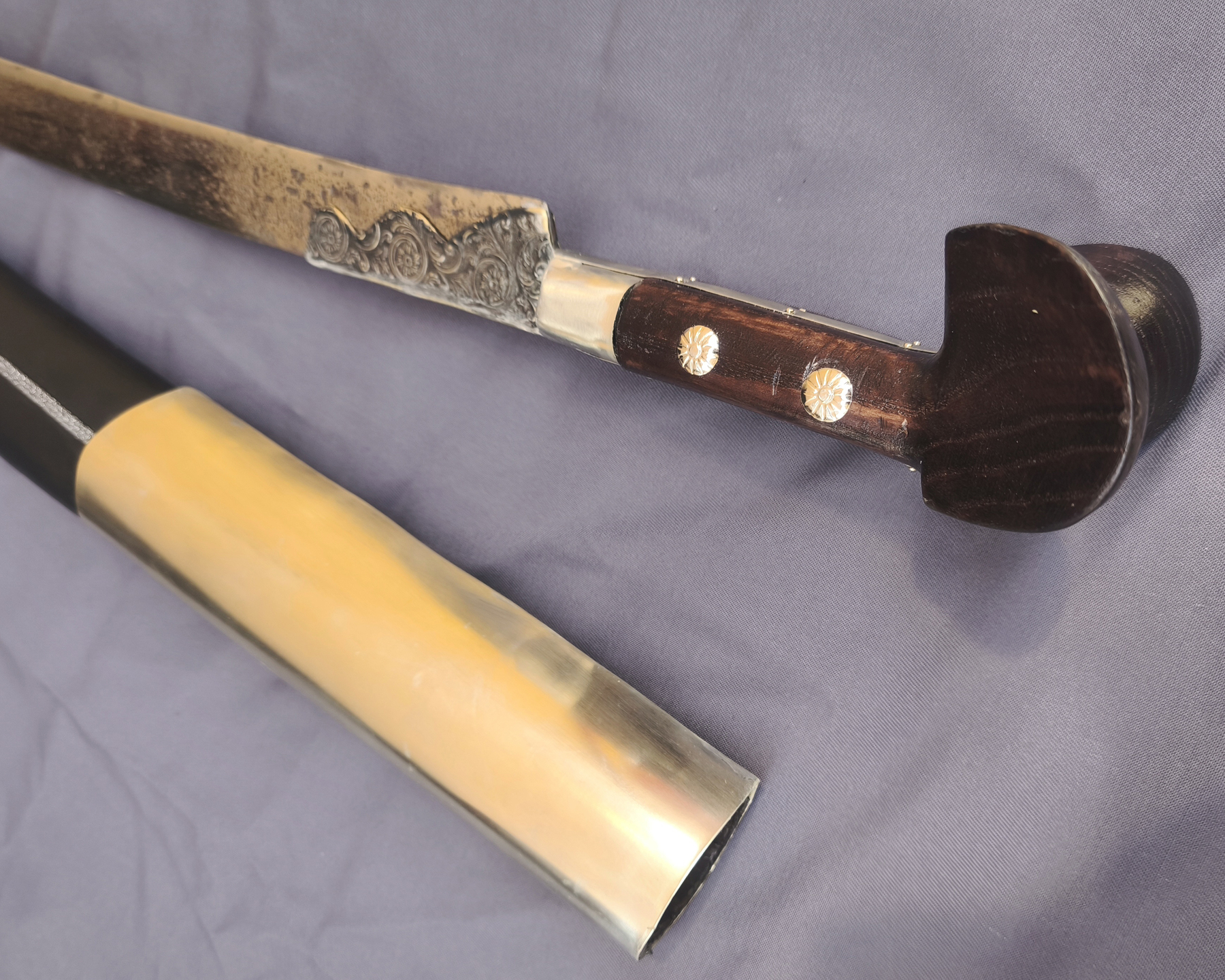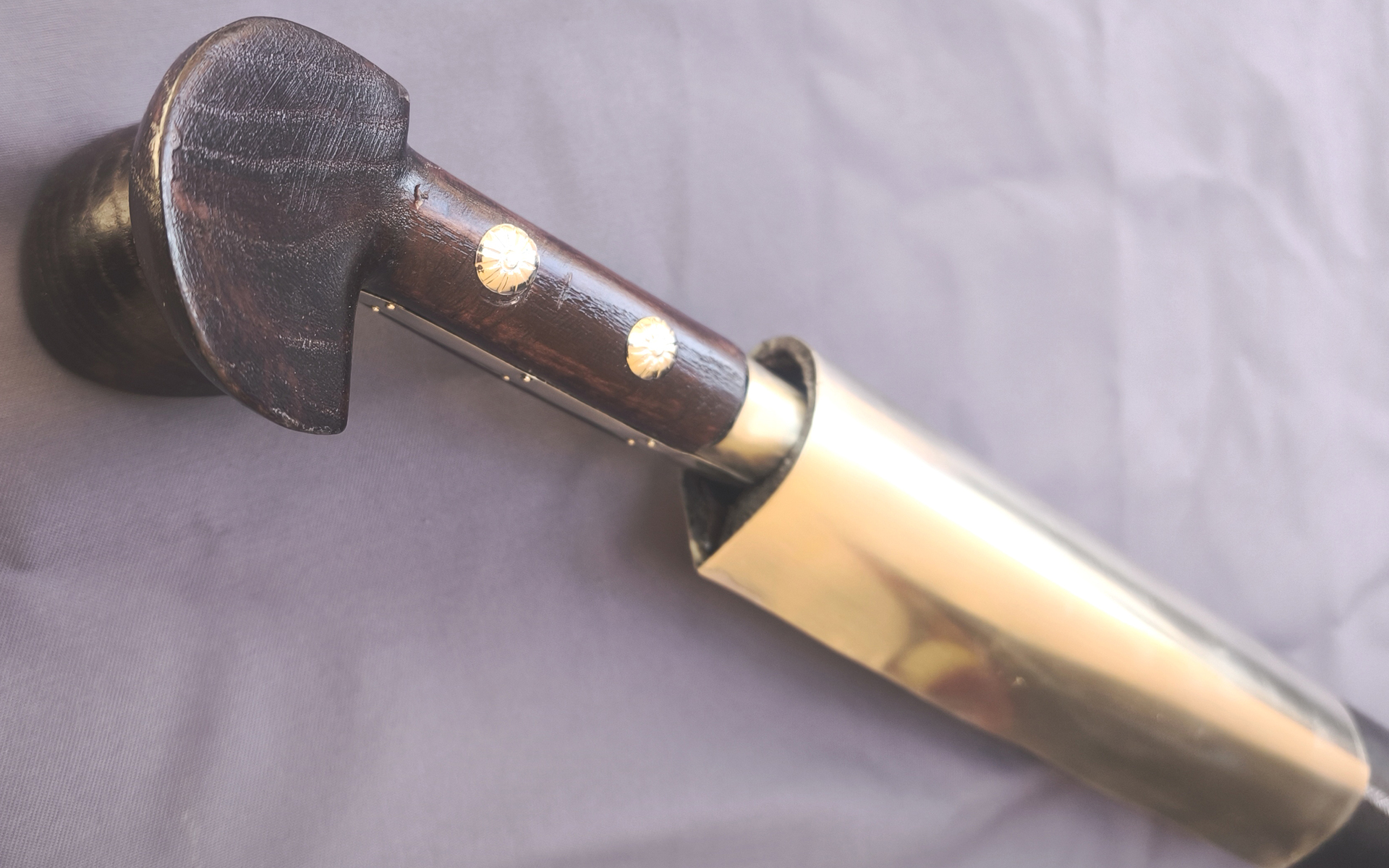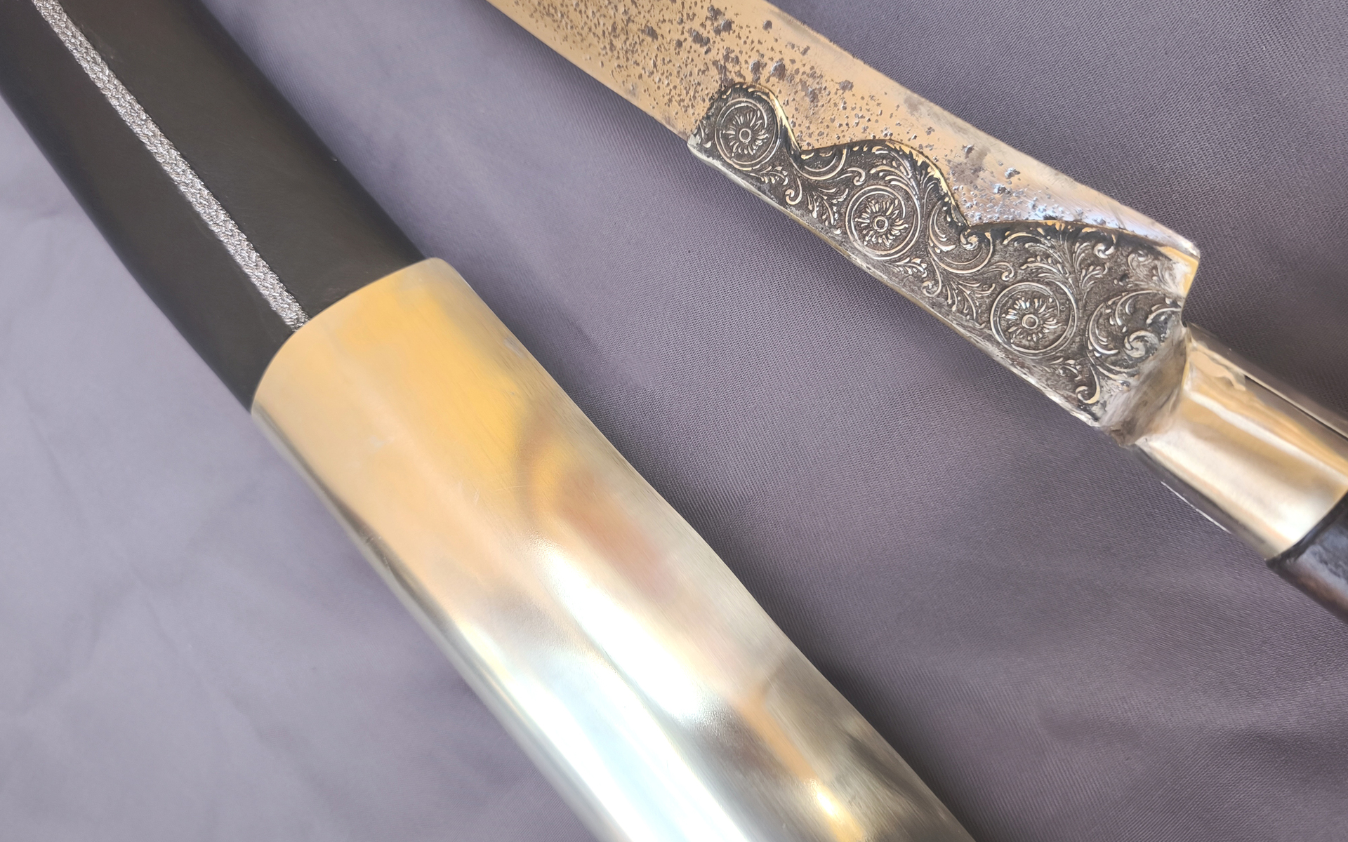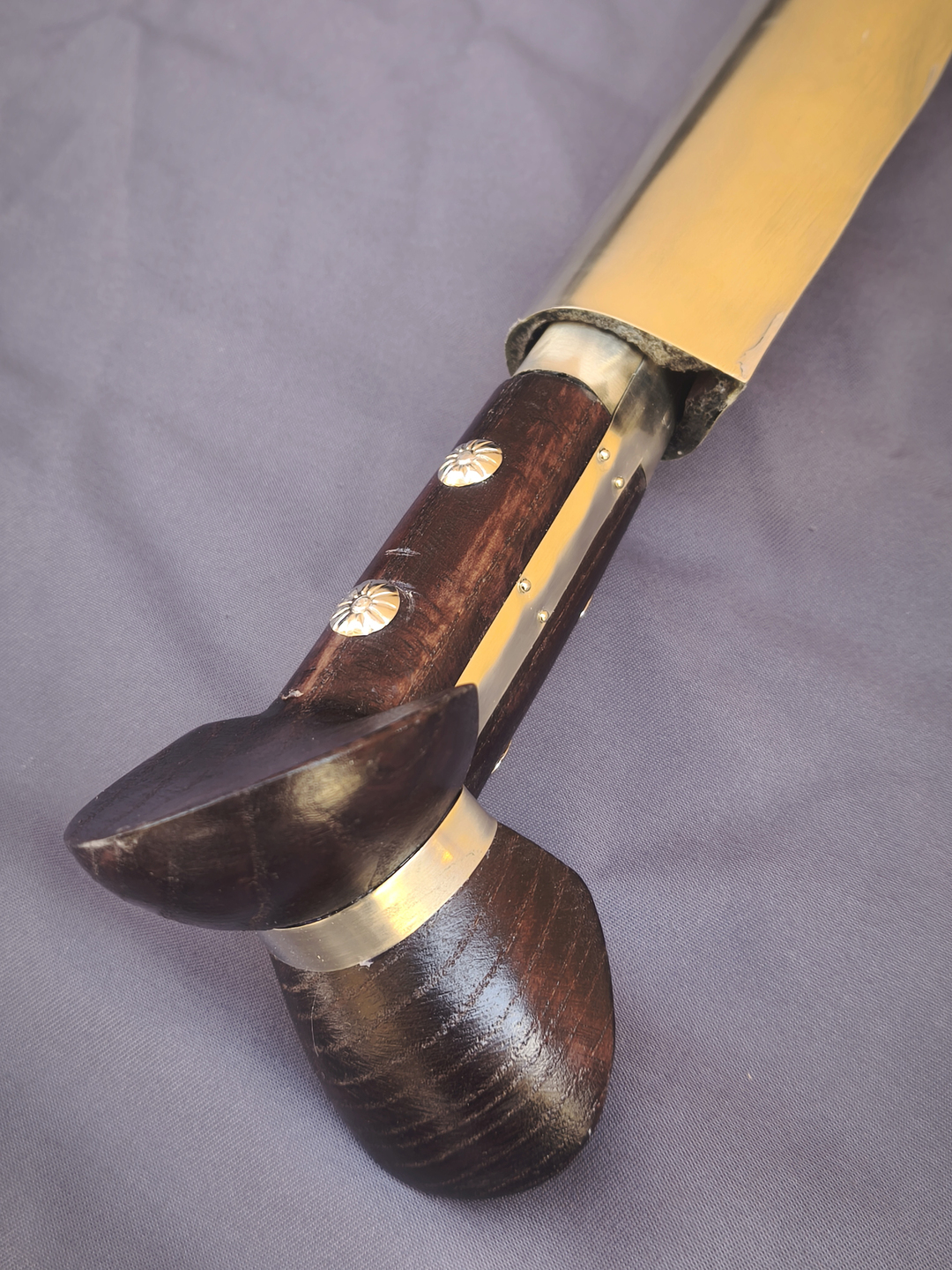 Η λεπίδα είναι φτιαγμένη από μεσαίας σκληρότητας χάλυβα, ενώ το θηκάρι διακοσμείται με Γερμανικό ασήμι και δέρμα. Η λαβή είναι ξύλινη, συνδυάζοντας ανθεκτικότητα με καλαίσθητη εμφάνιση.