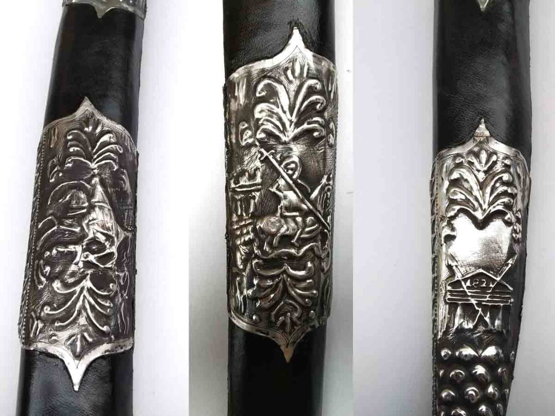 Ένα αυθεντικά καλλιτεχνικό αντίγραφο ηπειρωτικού γιαταγανιού, εμπνευσμένο από την παραδοσιακή οπλοτεχνία της Ηπείρου. Το θηκάρι είναι κατασκευασμένο από αποφλοιωμένο δρύινο ξύλο, επενδυμένο με δέρμα και περίτεχνο κράμα ασημιού και χαλκού, διακοσμημένο με ανάγλυφα μοτίβα που απεικονίζουν λέπια, λάφυρα, λουλούδια, λάβαρα και τον Άγιο Γεώργιο.