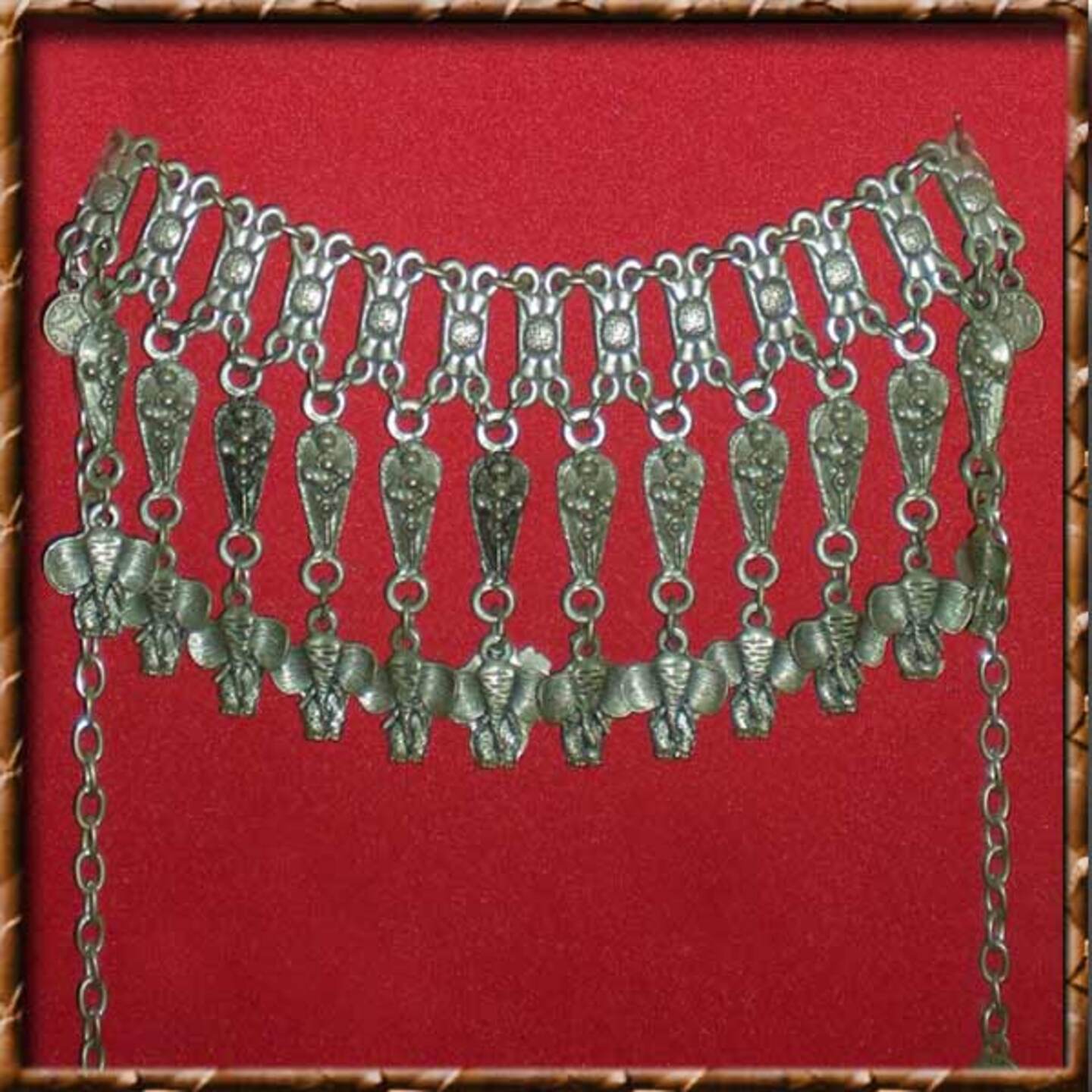 Γυναικείο κόσμημα λαιμού, απαρτίζεται απο πολλά σκαλιστά κομμάτια τα οποία ενώνονται μεταξύ τους με κρίκους. Φέρει σχέδια Ασιατικής προέλευσης.