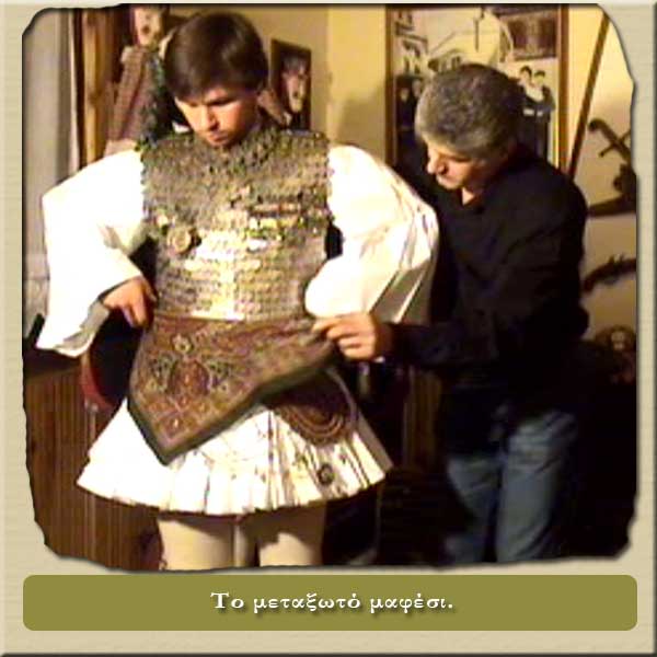 Το λαιμό του στολίζει το γκιουρντάνι στη συνέχεια και πάνω από τη φουστανέλα τοποθετείται το δερμάτινο σελάχι.