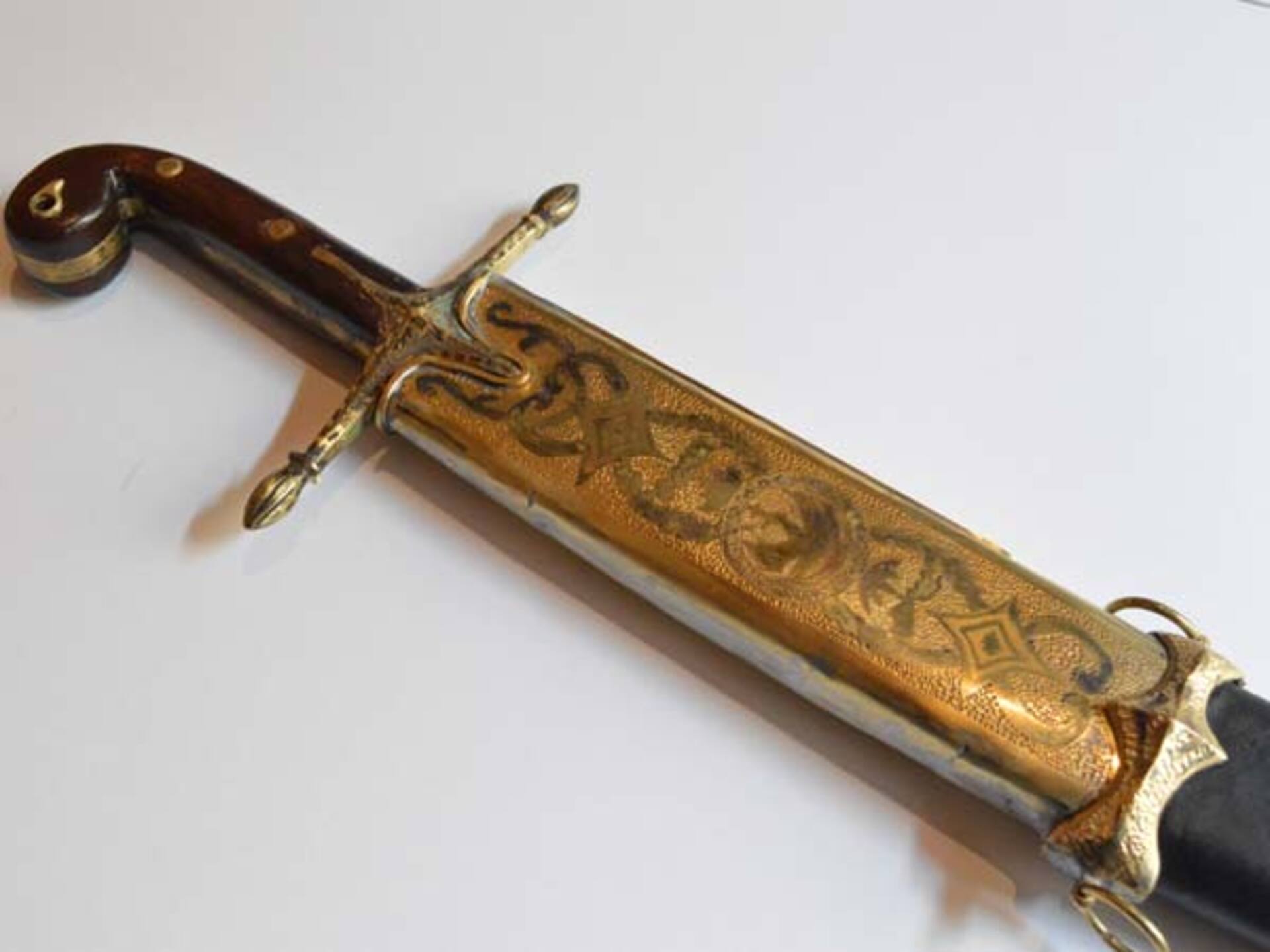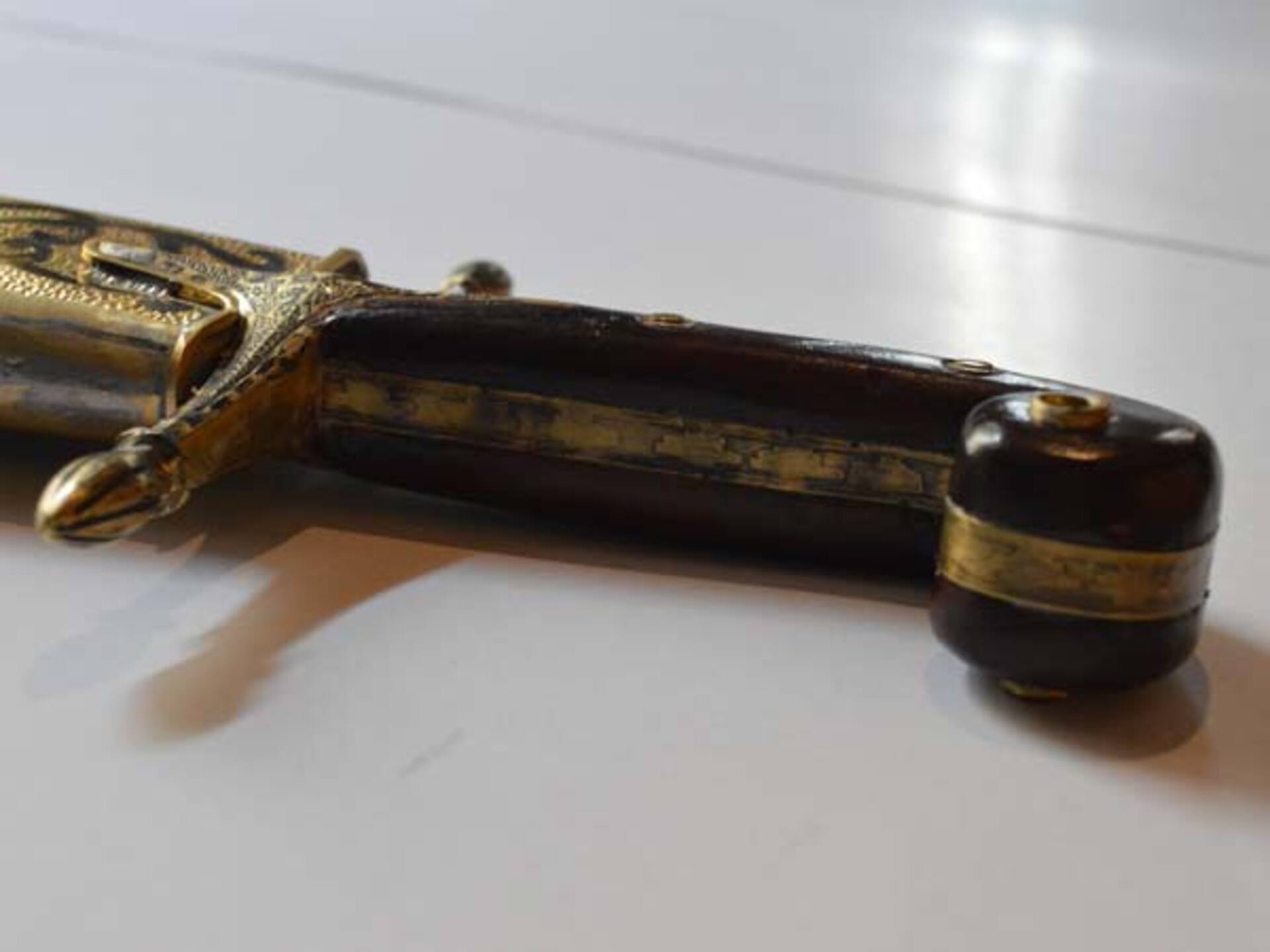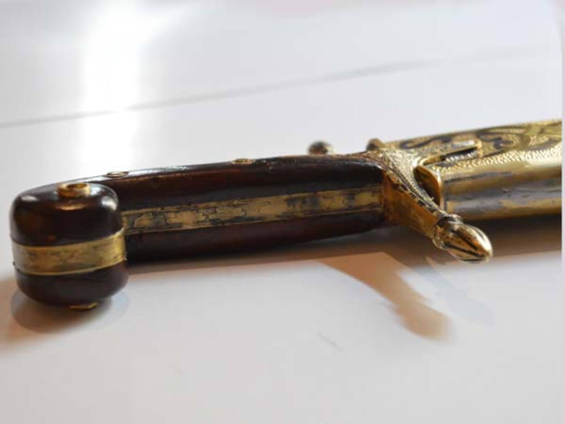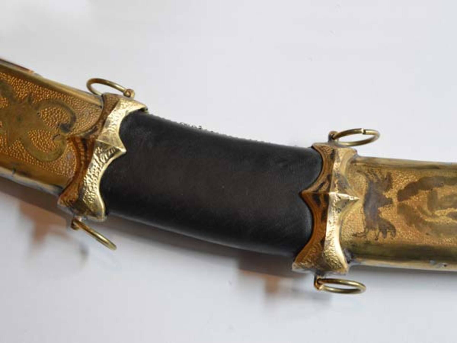 Το θηκάρι είναι επενδυμένο με μαύρο δέρμα ραμμένο σε παραδοσιακό σύρμα με κρίκους, συνδυασμένο με περίτεχνα μπρούτζινα διακοσμητικά και εγχάρακτο σχέδιο. Το μανίκι (λαβή) είναι φτιαγμένο από ξύλο άγριας κρανιάς, προσφέροντας αυθεντική αίσθηση και στιβαρότητα.