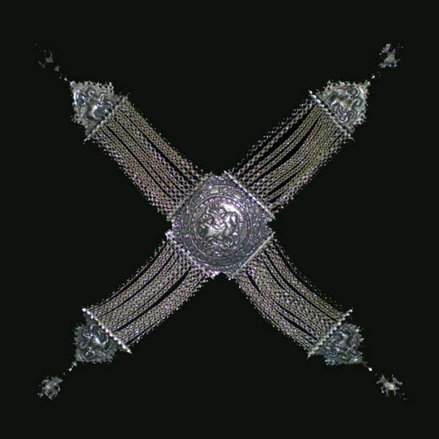 Εντυπωσιακό επάργυρο κιουστέκι σε σχήμα σταυρού, εμπνευσμένο από τη βυζαντινή παράδοση και τη χριστιανική εικονογραφία. Στο κεντρικό μετάλλιο, όπως και στα τέσσερα άκρα, απεικονίζεται η μορφή του Αγίου Γεωργίου έφιππου, σε σκηνή νίκης επί του δράκου — σύμβολο δύναμης, πίστης και προστασίας. Τα επιμέρους τμήματα ενώνονται με περίτεχνες αλυσίδες βυζαντινού τύπου, δημιουργώντας ένα ενιαίο σταυροειδές σχέδιο.