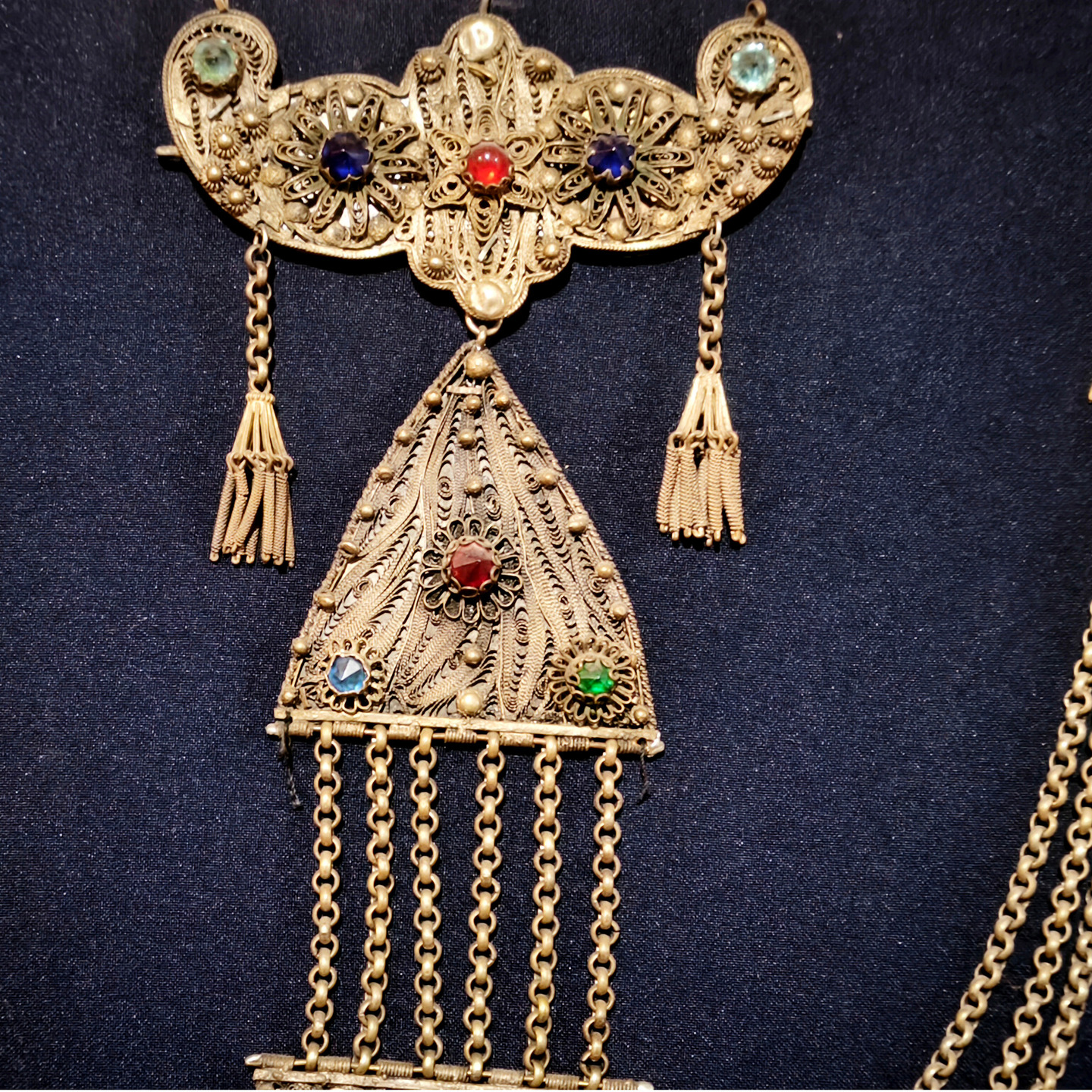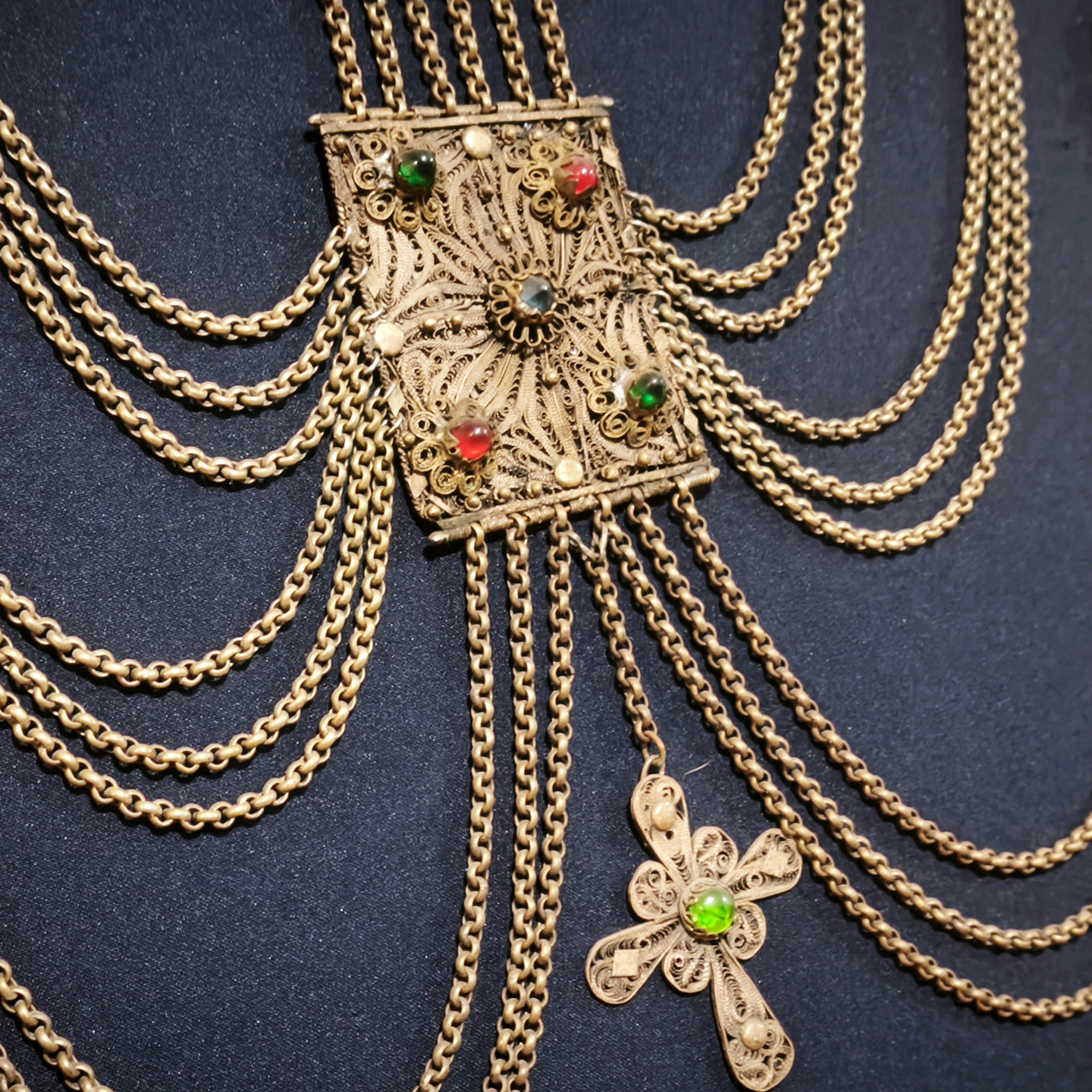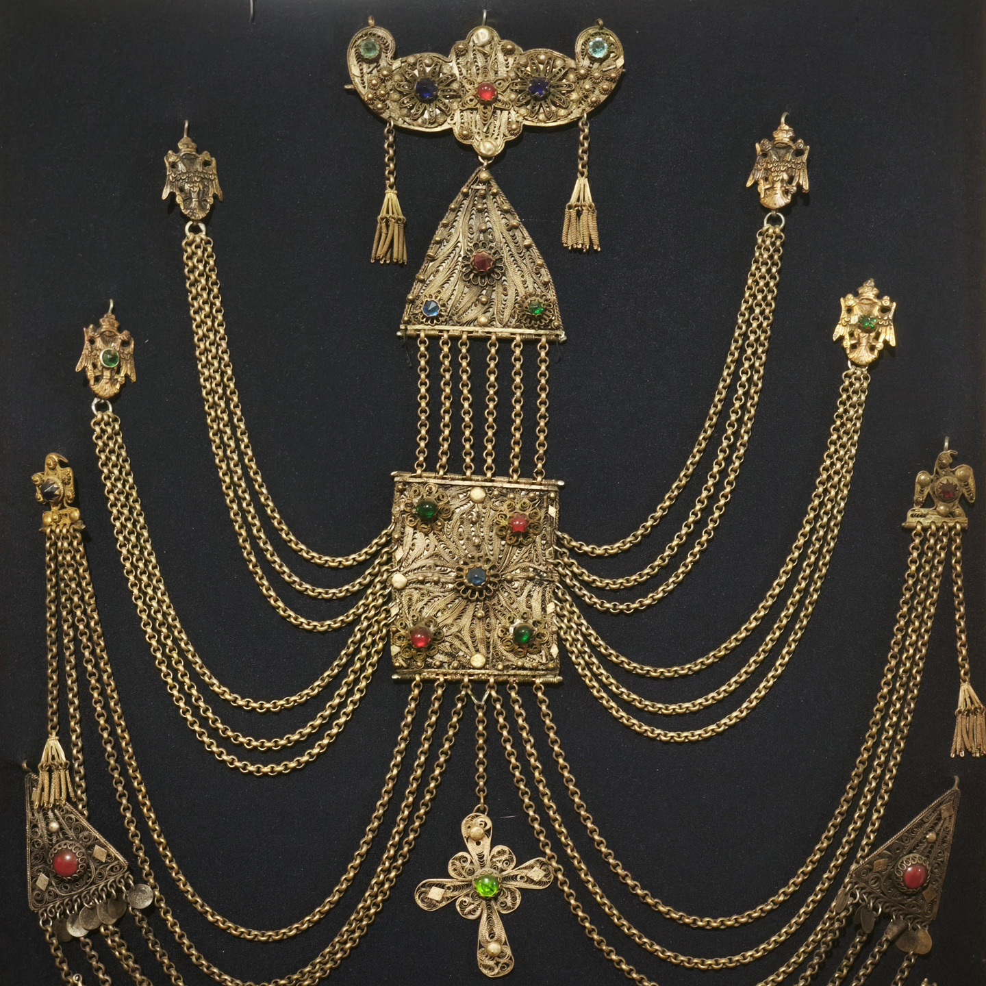 Τα τριγωνικά και ορθογώνια μεταλλικά μοτίβα, διακοσμημένα με πολύχρωμες πέτρες και συνδεδεμένα με αλυσίδες πάχους 10 χιλιοστών, αναδεικνύουν την εκλεπτυσμένη τεχνική του συρματερού — μια μέθοδος που άνθισε στη Μακεδονία και αποτέλεσε χαρακτηριστικό στοιχείο της λαϊκής αισθητικής και του στολισμού των γυναικών σε επίσημες περιστάσεις.