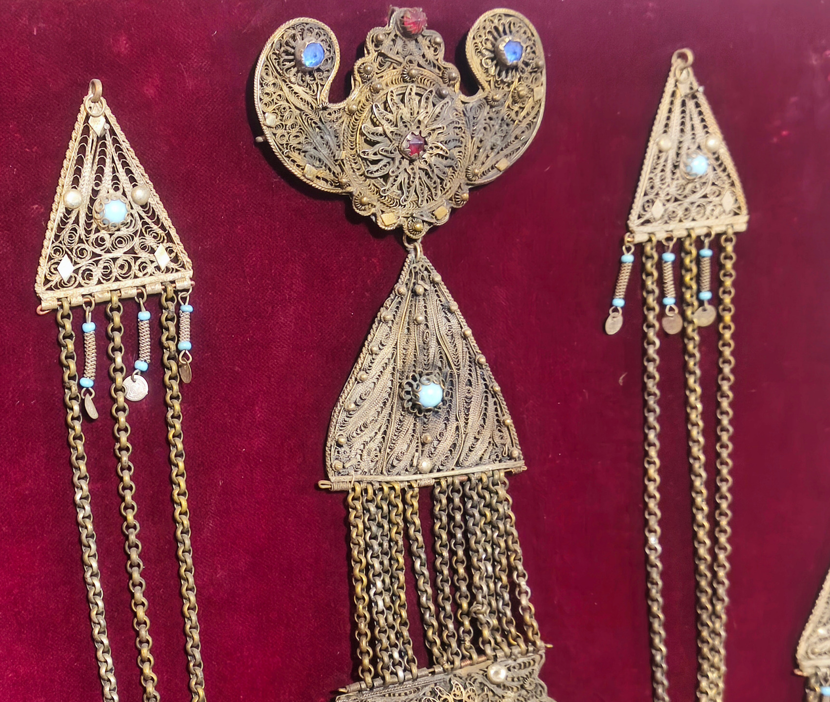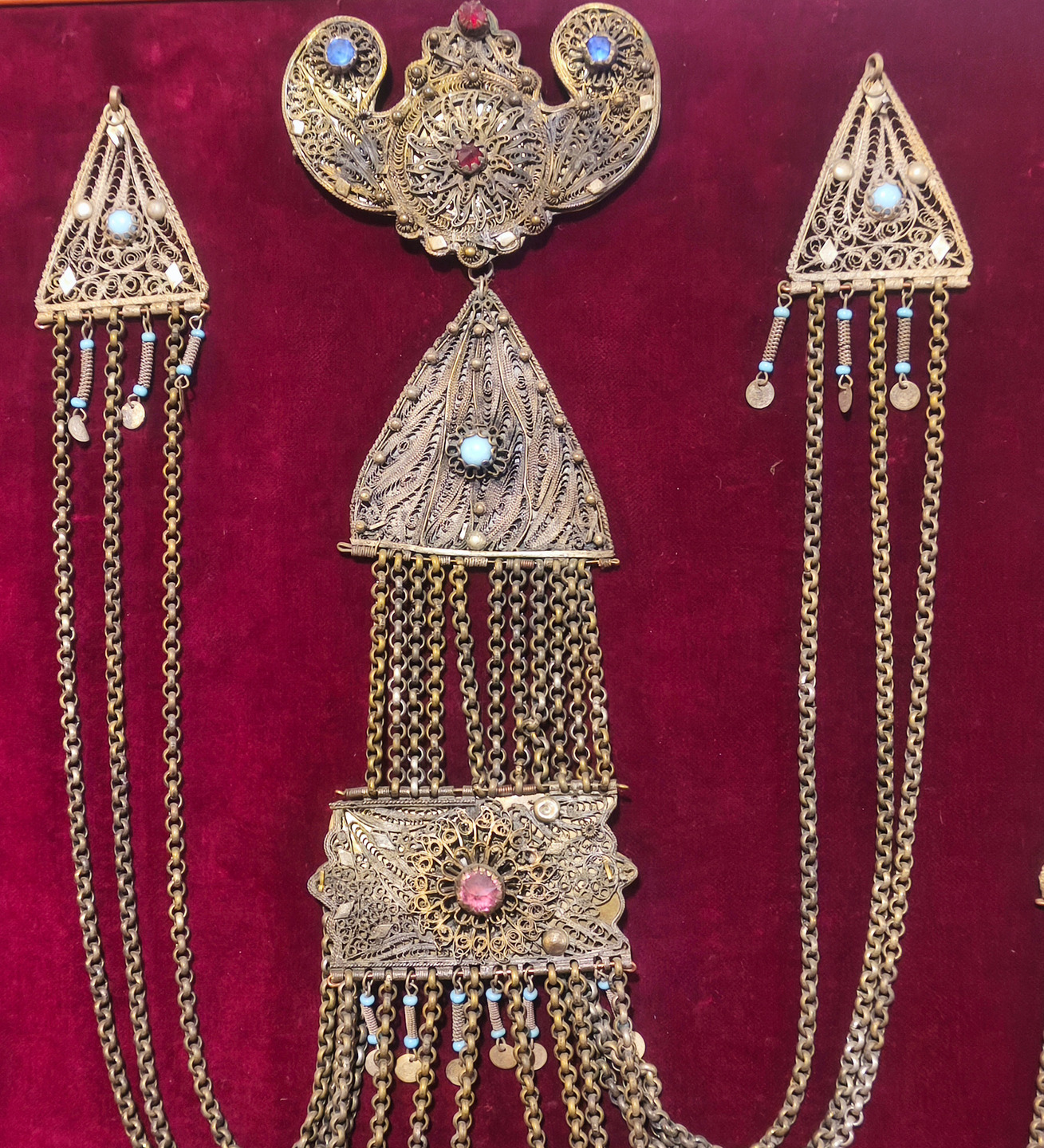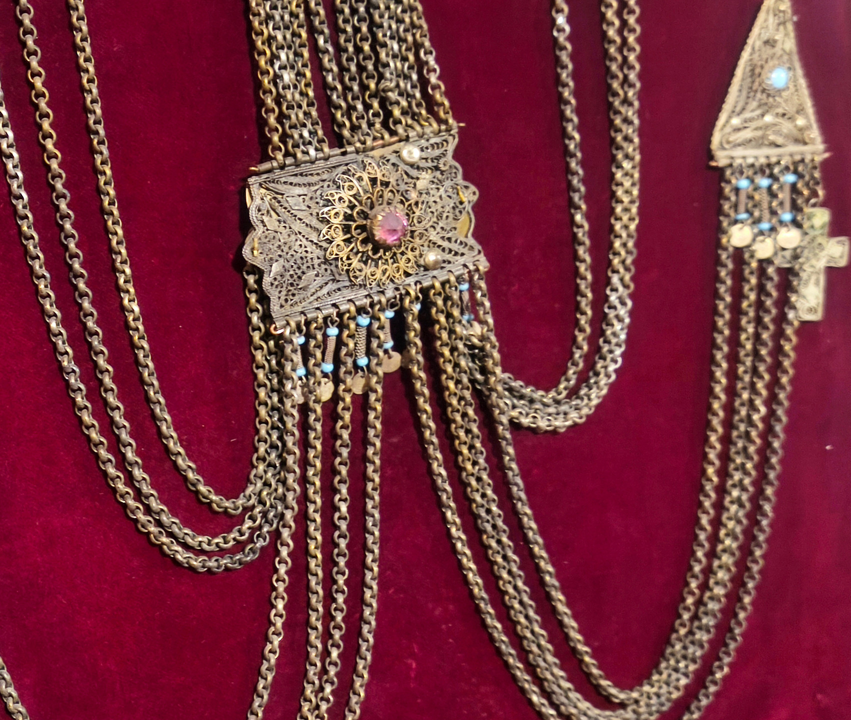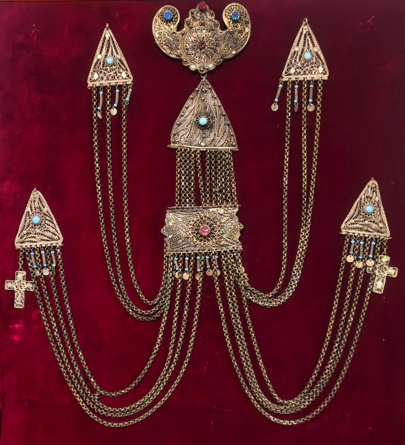 Ένα αυθεντικό χειροποίητο αντίγραφο παραδοσιακού μακεδονικού κιουστεκιού, φιλοτεχνημένο με τη λεπτοδουλεμένη τεχνική του συρματερού. Το κόσμημα αποτελείται από τριγωνικά και ορθογώνια στοιχεία, συνδεδεμένα με αλυσίδες 10 χιλιοστών, διακοσμημένα με πολύχρωμες πέτρες και μικρά μεταλλικά στοιχεία.