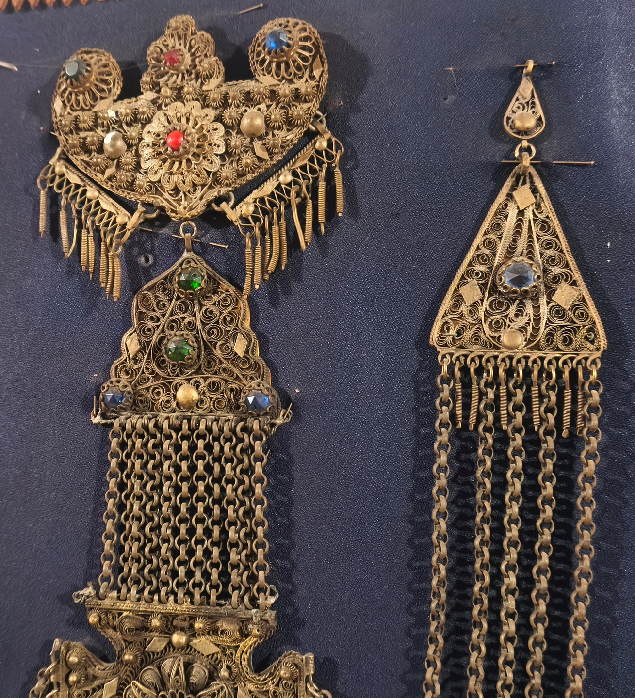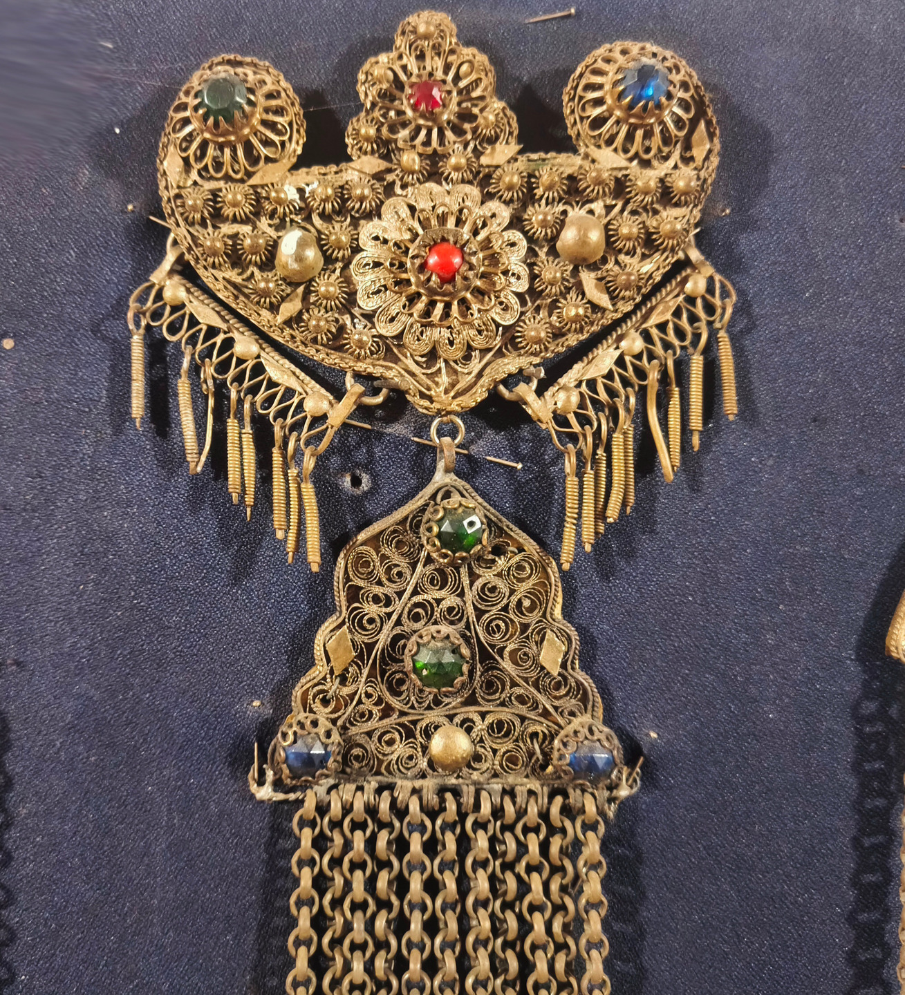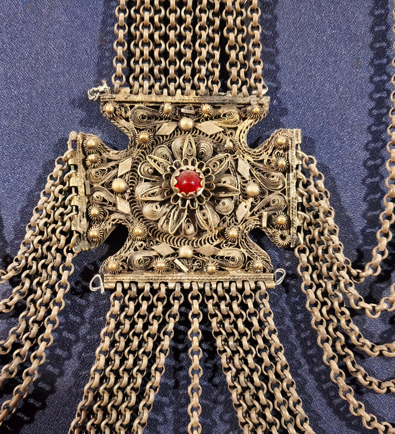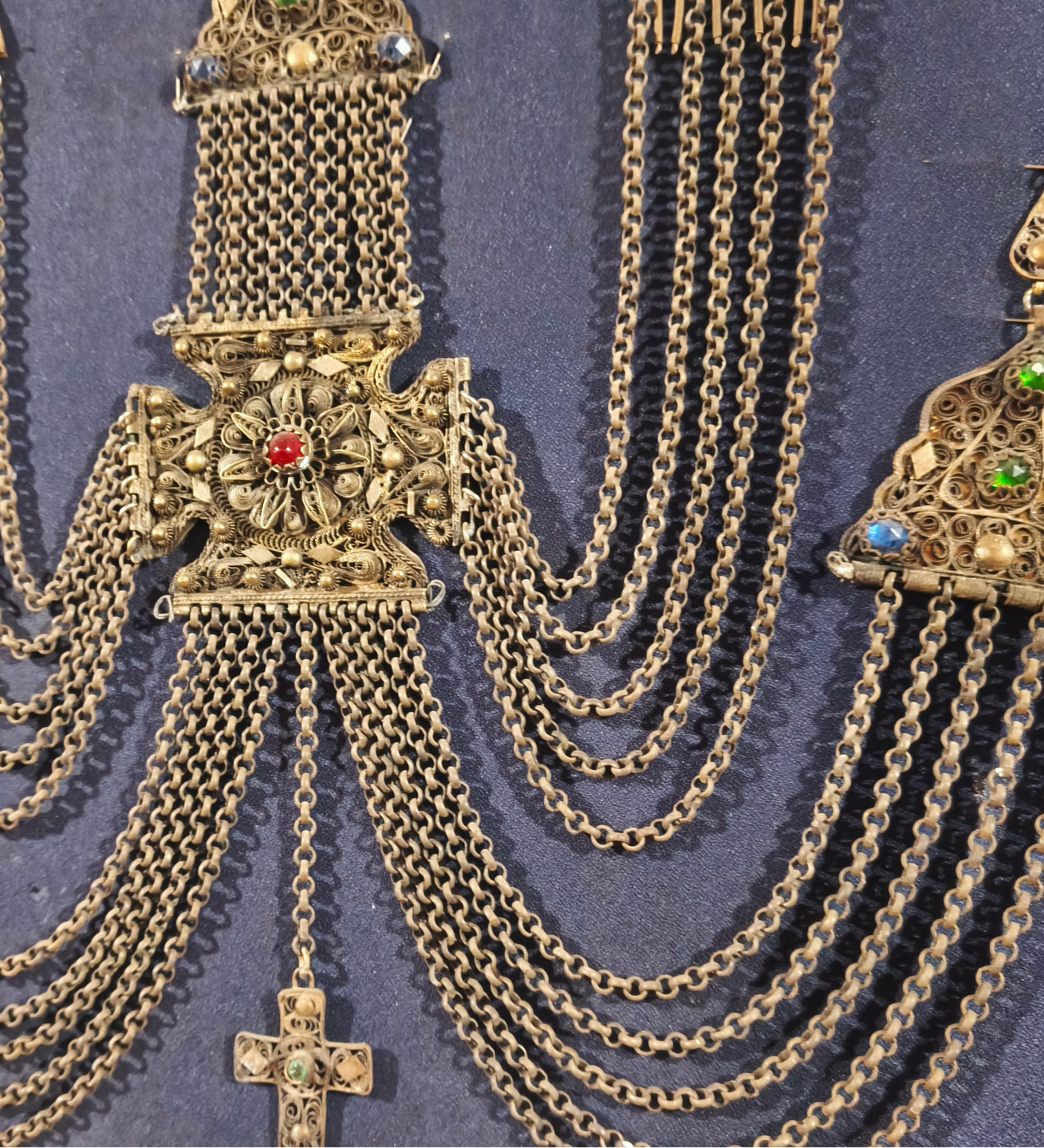 Πρόκειται για περίτεχνο κόσμημα πλάτης και στήθους, σύμβολο πλούτου και κοινωνικής θέσης των ευκατάστατων Θεσσαλών των περασμένων αιώνων. Η συμμετρική του διάταξη, η διακόσμηση με πολύχρωμες πέτρες και η μοναδική λεπτομέρεια στο φιλιγκράν αποδεικνύουν τη βαθιά γνώση και καλλιτεχνική ευαισθησία του δημιουργού του.