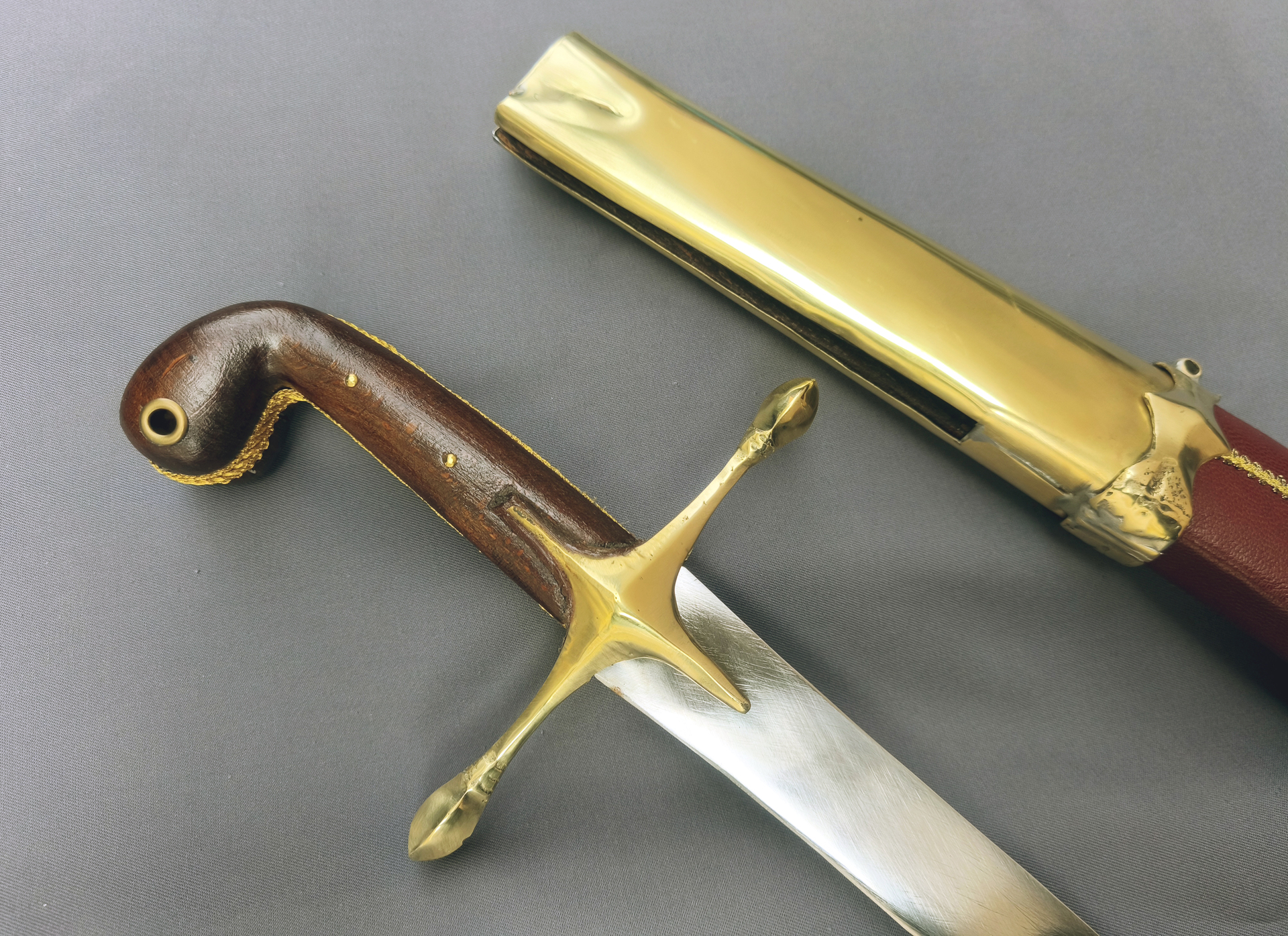 Η λεπίδα, κατασκευασμένη από μεσαίας σκληρότητας χάλυβα στο εργαστήρι μας, αποδίδει την αυθεντική μορφή του ιστορικού όπλου, ενώ το θηκάρι είναι ντυμένο με δέρμα και ορείχαλκο, συνδυάζοντας παραδοσιακή αισθητική με υψηλή ποιότητα κατασκευής.