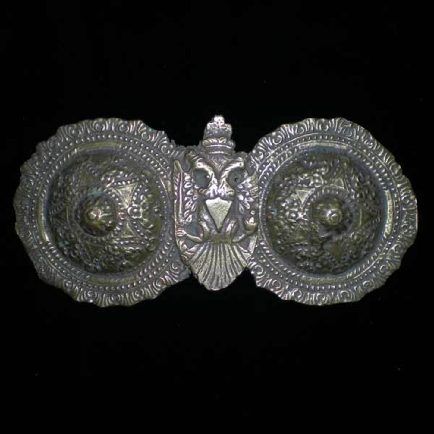 Χυτή πόρπη μεγάλου μεγέθους. Διακρίνεται ο Δικέφαλος Αιτός στη μέση όπου χωρίζει και κουμπώνει με γάντζο και θυλίκι. Σκαλιστές φιγούρες που φανερώνουν άνθη. Στις δύο άκρες υπάρχουν κοπιτσες για να πιάνεται η πόρπη στη γυνακεία ζώνη και έπειτα να σφίγγει τη μέση της γυναίκας.