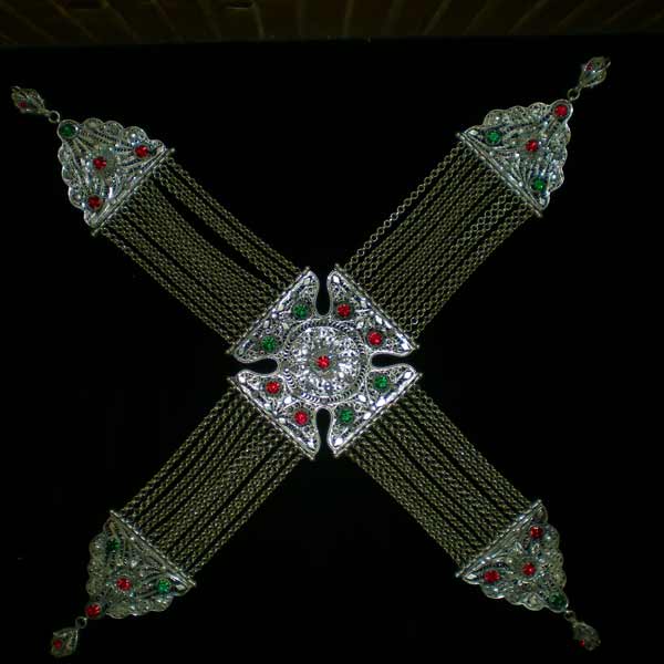 Χειροποίητο κόσμημα πλάτης και στήθους. Φτιαγμένο εξ΄ολοκλήρου απο σύρμα. Τα κομμάτια που το απαρτίζουν είναι δουλεμένα με ψιλό ασημένιο σύρμα και ενώνονται με βυζαντινή αλυσίδα. Στις άκρες οι κοψιάδες βοηθούν το κιουστέκι να στηριχτεί ενώ σε όλη την επιφάνεια στερεώνονται πέτρες σε κόκκινο και πράσινο χρώμα.