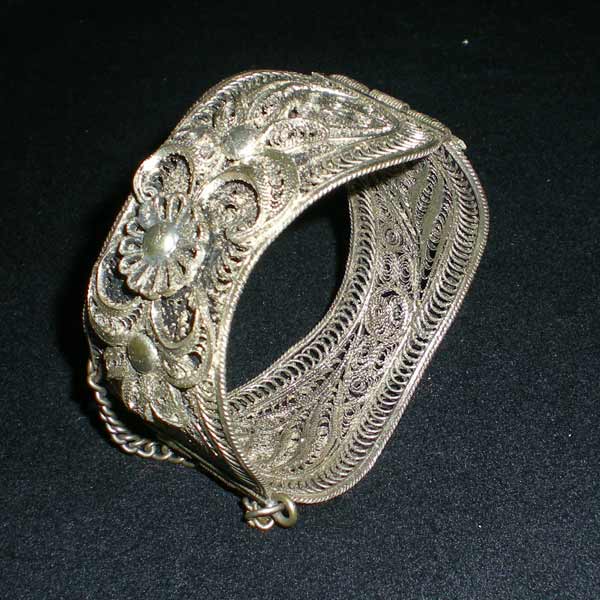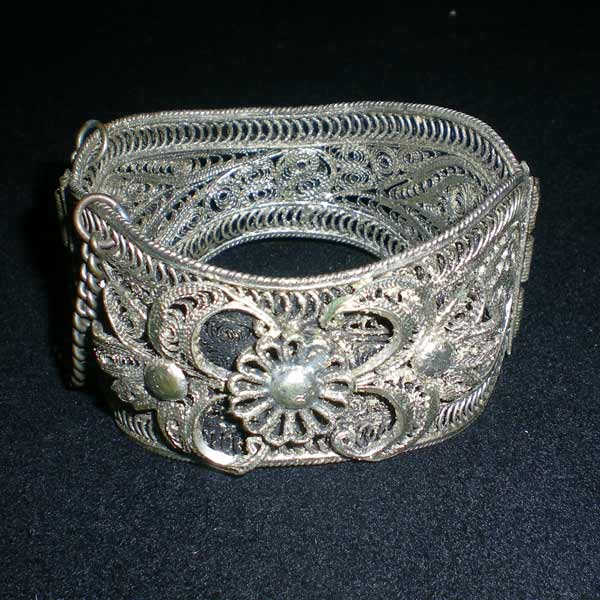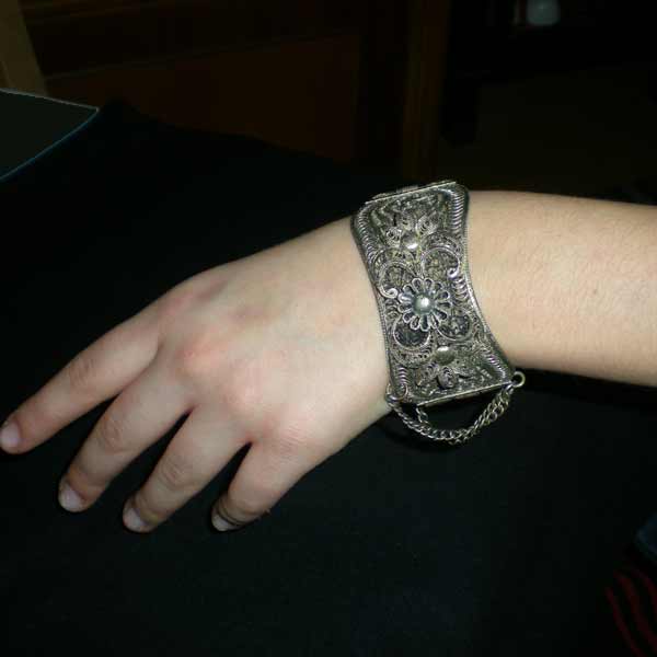 Χειροποίητο κόσμημα χειρός. Άπταιστη δημιουργία απο γνωστό Έλληνα καλλιτέχνη. Τα μικρά ασημένια κομμάτια σύρματος που το απαρτίζουν σχηματίζουν σχέδια απο άνθη και λουλούδια. Παλιότερα φοριόταν απο γυναίκες στο γάμο. Περνιέται στο δεξί χέρι και εκφράζει τη γονιμότητα της γυναίκας. Ανοίγει και κουμπώνει με ένα πυράκι στη μέση του βραχιολιού.