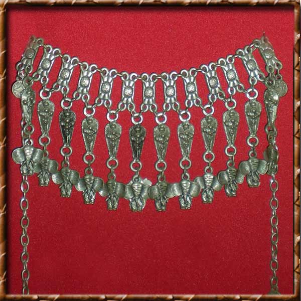 Γυναικείο ασημένιο κόσμημα λαιμού δουλεμένο στο χέρι, απαρτίζεται απο πολλά σκαλιστά κομμάτια τα οποία ενώνονται μεταξύ τους με κρίκους. Φέρει σχέδια Ασιατικής προέλευσης.