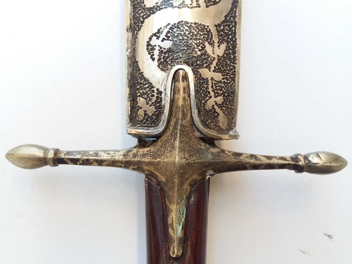 Πιστό αντίγραφο από τούρκικο σαμσίρ που φιλοξενείται στο Λαογραφικό Μουσείο της Νάουσας. Η λάμα του είναι φτιαγμένη από σκληρό χάλυβα. Το μανίκι ειναι απο άγρια κρανιά. Το θηκάρι είναι ντυμένο από μαύρο δέρμα και ασήμι αρζαντώ. Στο σκάλισμα διακρίνονται στοιχεία απο άνθη και λάφυρα. Συνοδέυεται απο ένα κορδόνι με φούντες για τη θήκη και μία φούντα για το μανίκι. Οι διαστάσεις του είναι 92cm ενώ φορεμένο στη θήκη είναι 95cm.