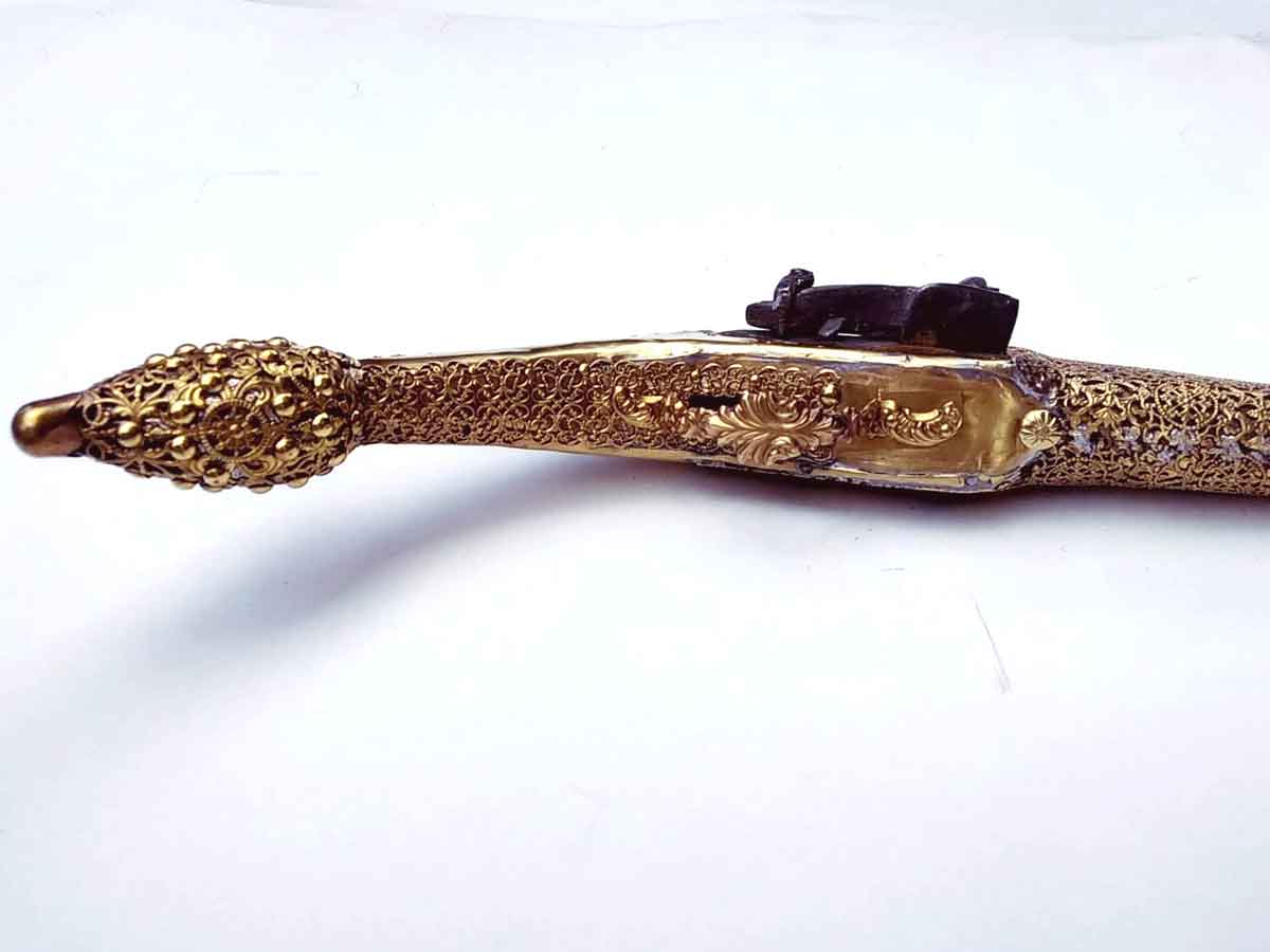 Πιστό αντίγραφο απο Αρβανίτικη Κουκουνάρα. Αποτελείται απο ξύλο ψημένης καρυδιάς, τυλιγμένο με φύλλο και σκαλιστά κομμάτια ορείχαλκου. Η κάνη είναι σε οκτάγωνο σχήμα και καταλήγει σε στρόγγυλο, το μήκος της είναι 34cm. Ο μηχανισμός είναι τύπου miquelet. To συνολικό μήκος της πιστόλας είναι 53cm.