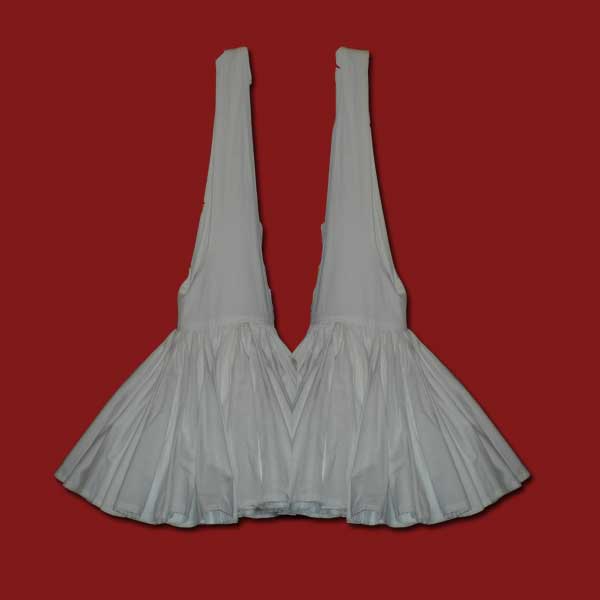 Μακεδονίτικη φουστανέλα ραμμένη στο χέρι απο αρίστης ποιότητας ιταλικό λευκό χασέ. Αποτελείται απο 400 λαγκιόλια (τρίγωνα κομμένα φύλλα) που γαζώνονται μεταξύ τους σχηματίζοντας πιέτες. Την συγκεκριμένη φουστανέλα την κατασκευάζουμε με χώρισμα στη μέση σχηματίζοντας δύο τιράντες, αριστερά και δεξιά.
