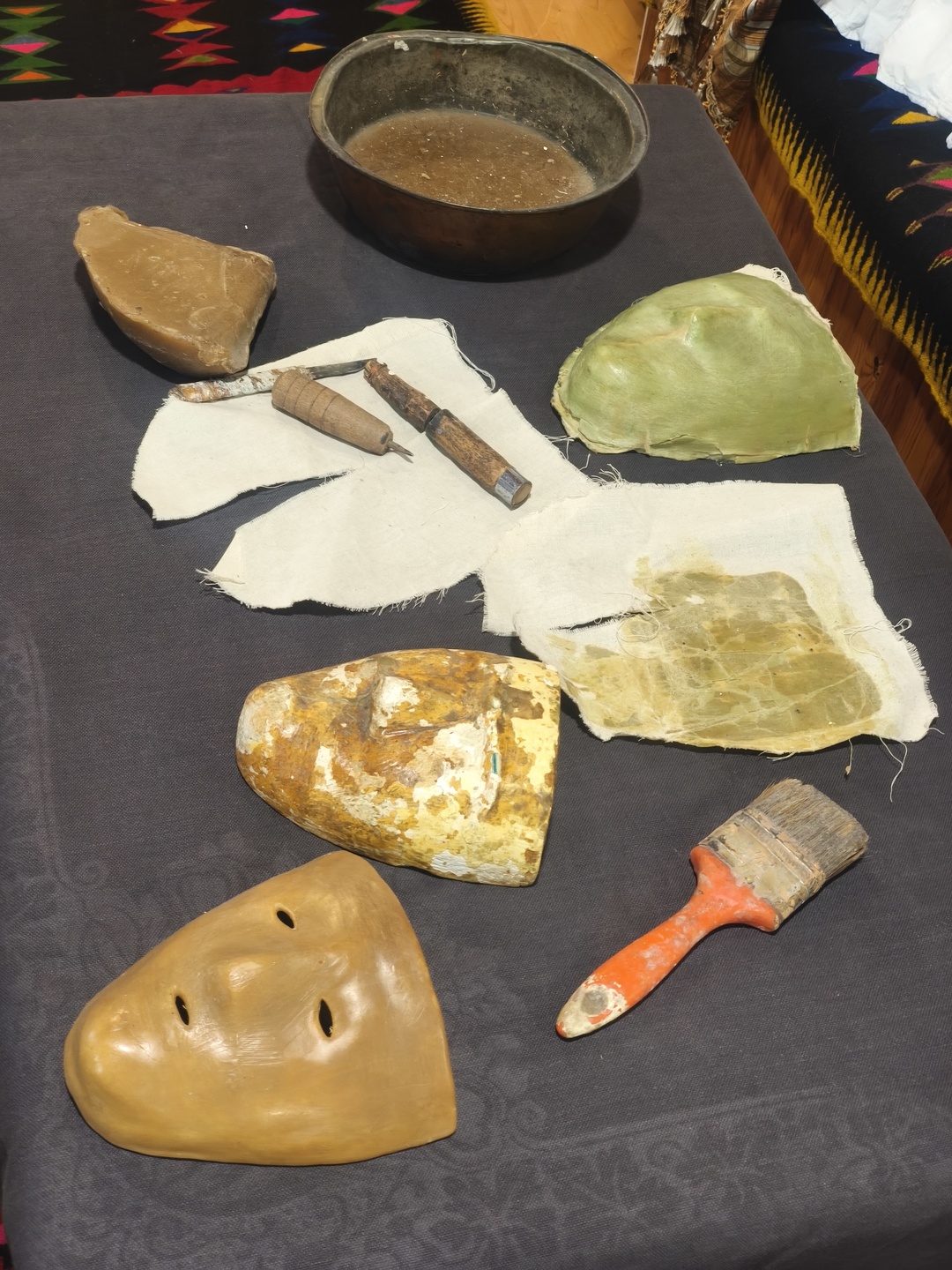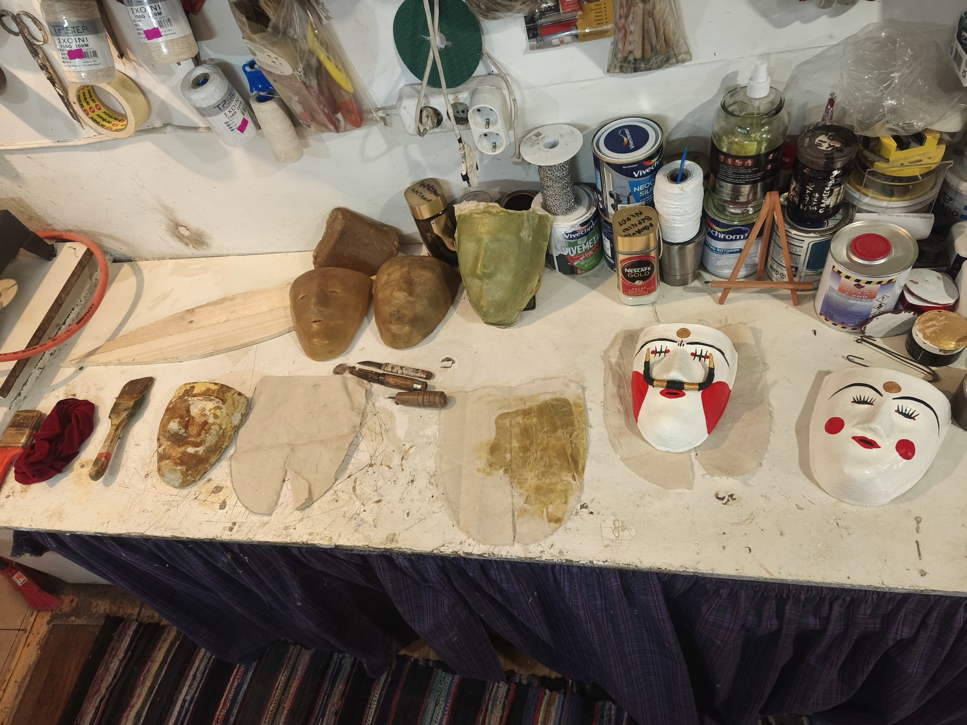 Η μάσκα φιλοτεχνείται σε γύψινο καλούπι από χοντρό πανί εμποτισμένο με γνήσιο κερί μέλισσας, αποκτώντας έτσι την χαρακτηριστική της στιβαρότητα και λεία υφή. Βάφεται με παραδοσιακά χρώματα λαδιού — το καθαρό λευκό του προσώπου, τα έντονα κόκκινα μάγουλα και χείλη, και τη χρυσή λεπτομέρεια στο μέτωπο — που αποδίδουν τη συμβολική καθαρότητα και την τελετουργική σημασία του εθίμου.