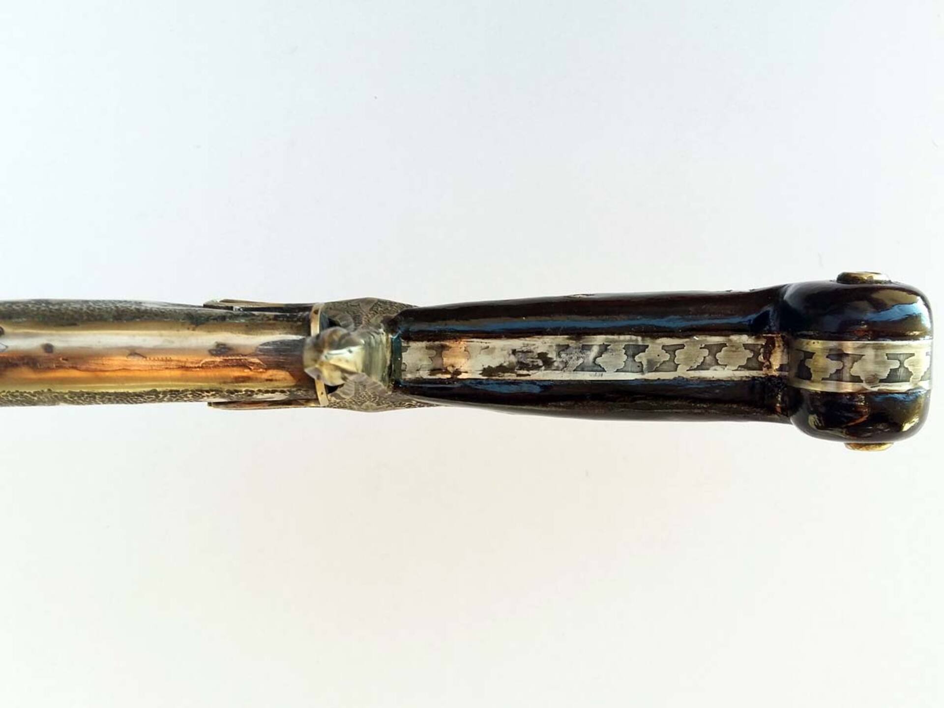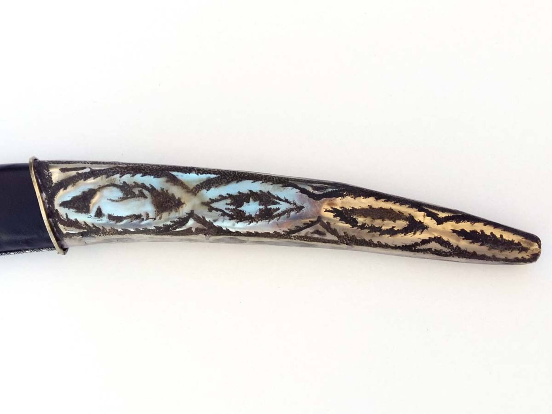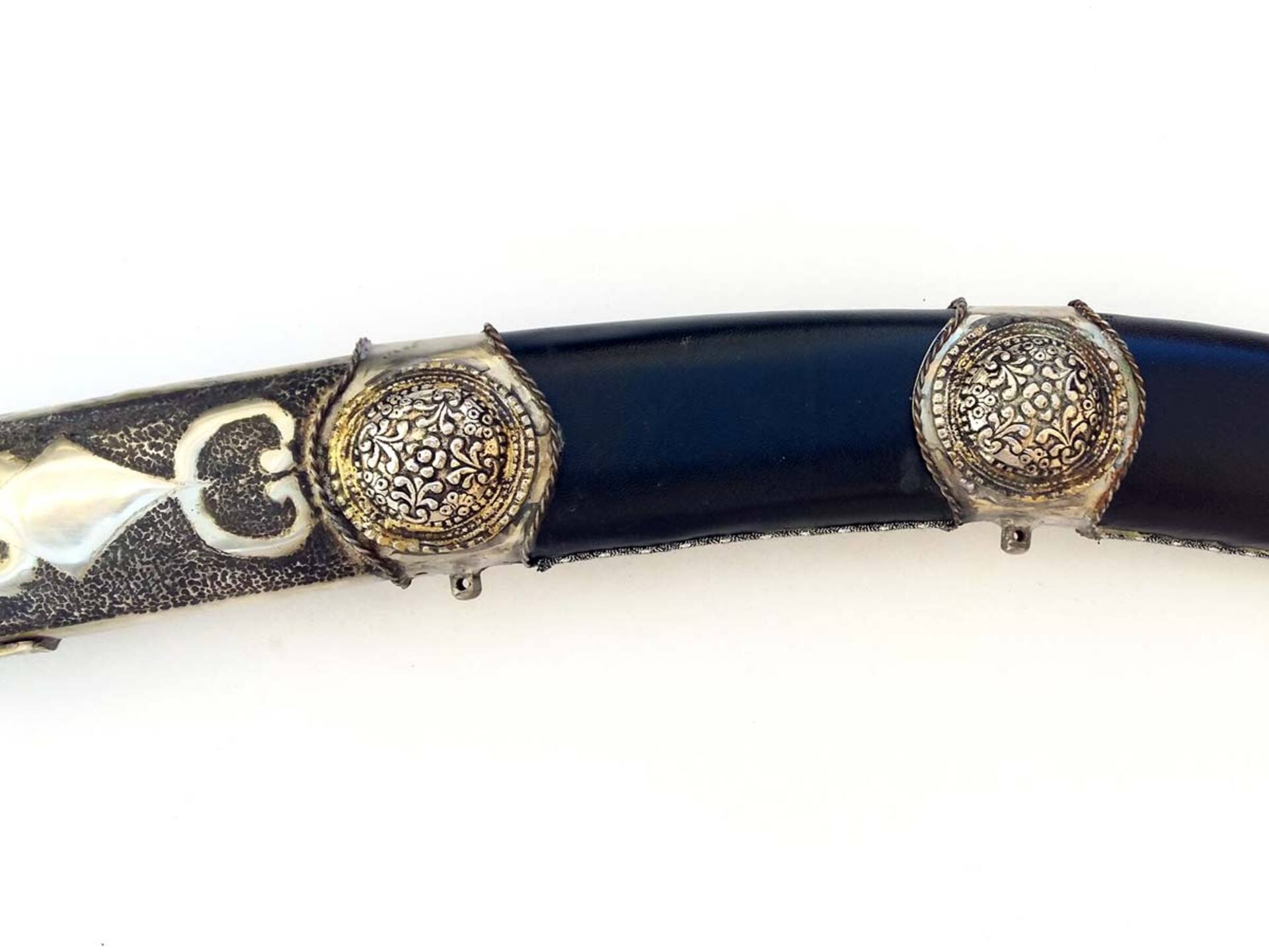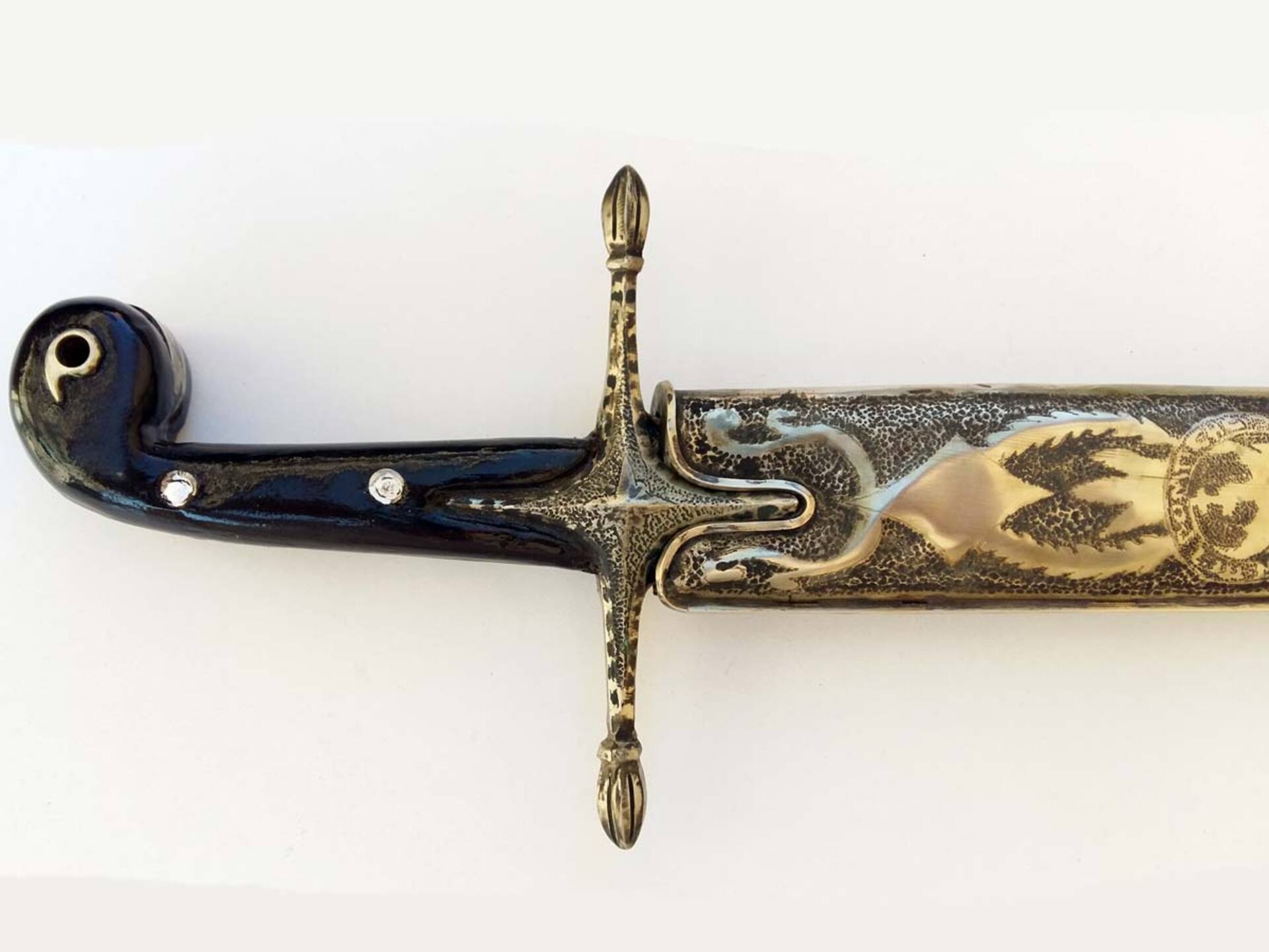 Το διακοσμημένο θηκάρι, επενδεδυμένο με μεταλλικά στοιχεία και παραδοσιακά μοτίβα, προσδίδει αίσθηση μεγαλοπρέπειας και αυθεντικότητας, αναδεικνύοντας τη δεξιοτεχνία της οπλουργικής τέχνης.