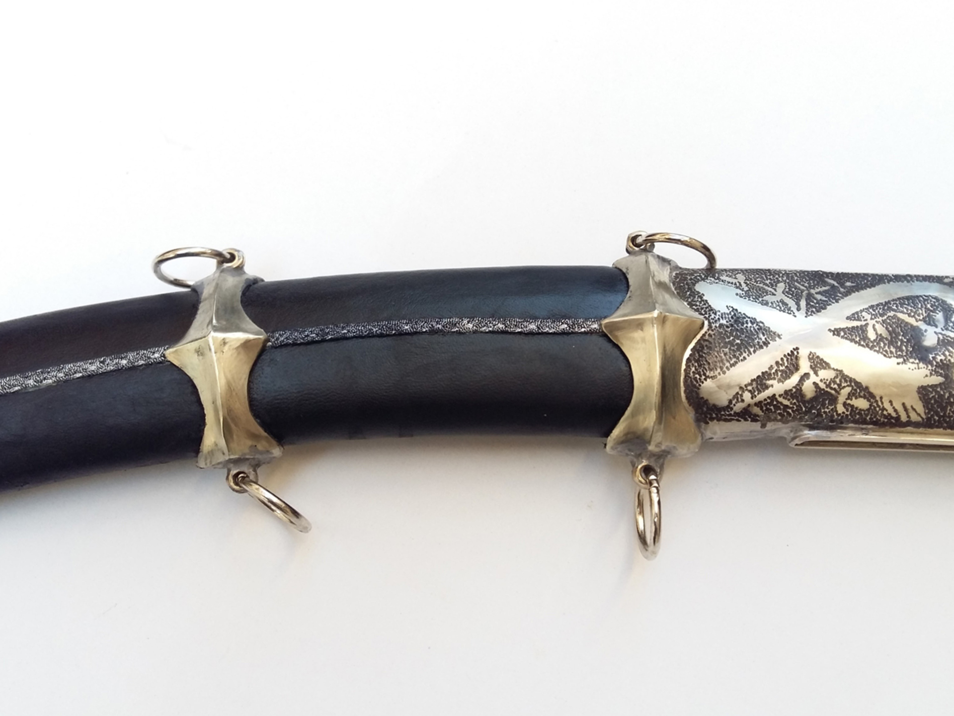 Η λεπίδα, από μεσαίας σκληρότητας χάλυβα, διαθέτει τη χαρακτηριστική καμπύλη που προσέδιδε ευελιξία και δύναμη στα χτυπήματα των ιππέων. Το θηκάρι, ξύλινο από πεύκο, είναι επενδεδυμένο με μαύρο δέρμα και στολισμένο με γερμανικό ασήμι, όπου απεικονίζονται σκαλιστά όπλα και λάφυρα της Επανάστασης — φόρος τιμής στην ιστορική κληρονομιά.