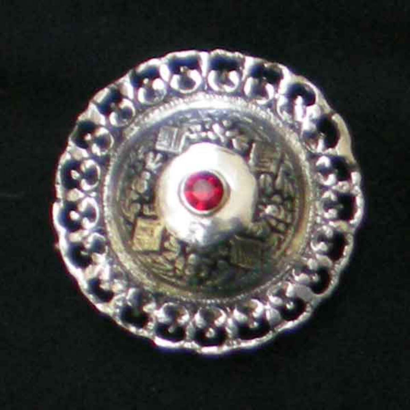 Εντυπωσιακό επάργυρο κόσμημα, εμπνευσμένο από την παραδοσιακή ελληνική λαϊκή τέχνη. Το περίτεχνο σχέδιο μαργαρίτας με τις καμπυλωτές φιγούρες και τα λεπτοδουλεμένα περιγράμματα αποτυπώνει την υψηλή αισθητική και την ακρίβεια της παραδοσιακής μεταλλοτεχνίας. Στο κέντρο του δεσπόζει μια κόκκινη πέτρα, σύμβολο ζωντάνιας και ευγένειας, που προσδίδει ιδιαίτερη λάμψη στο σύνολο.